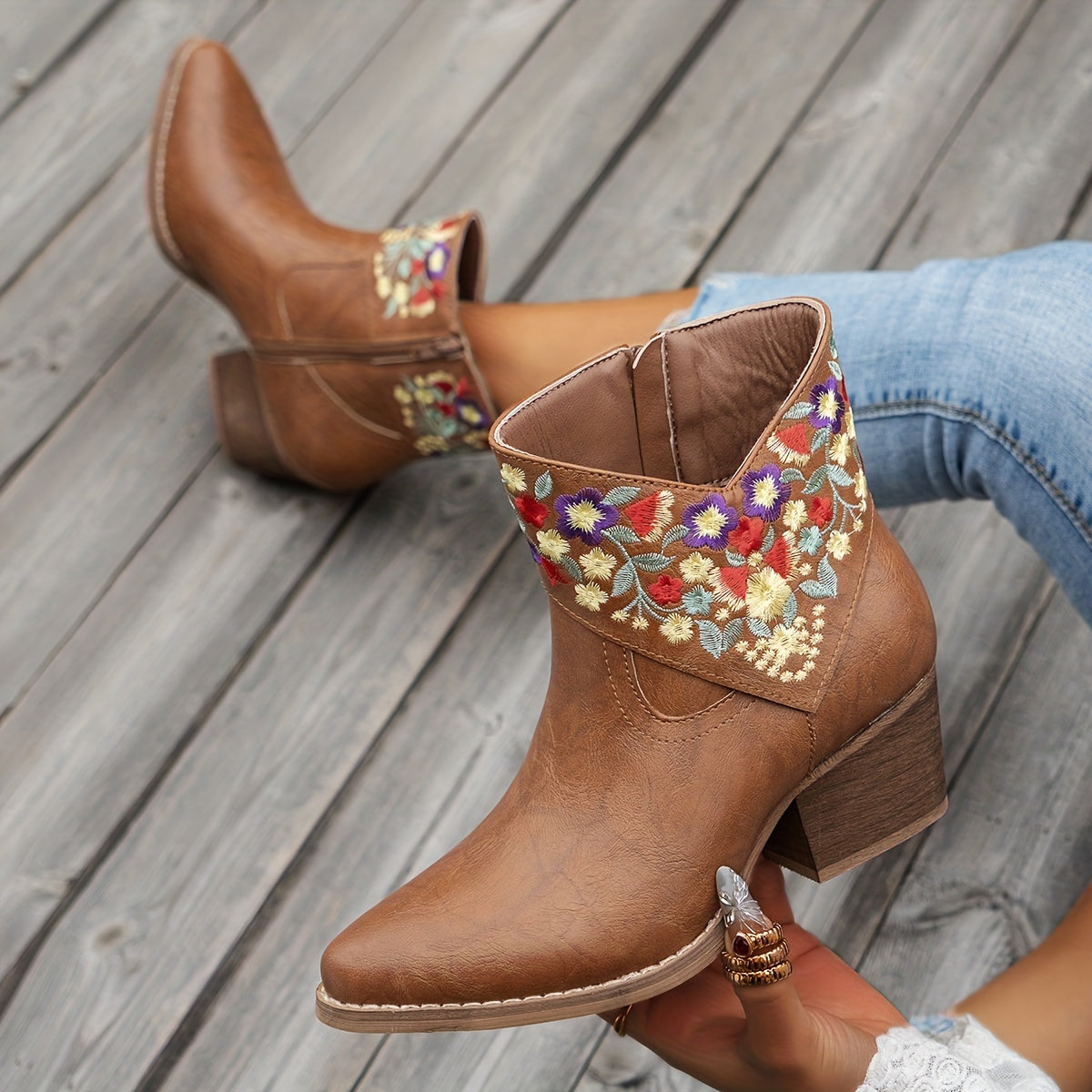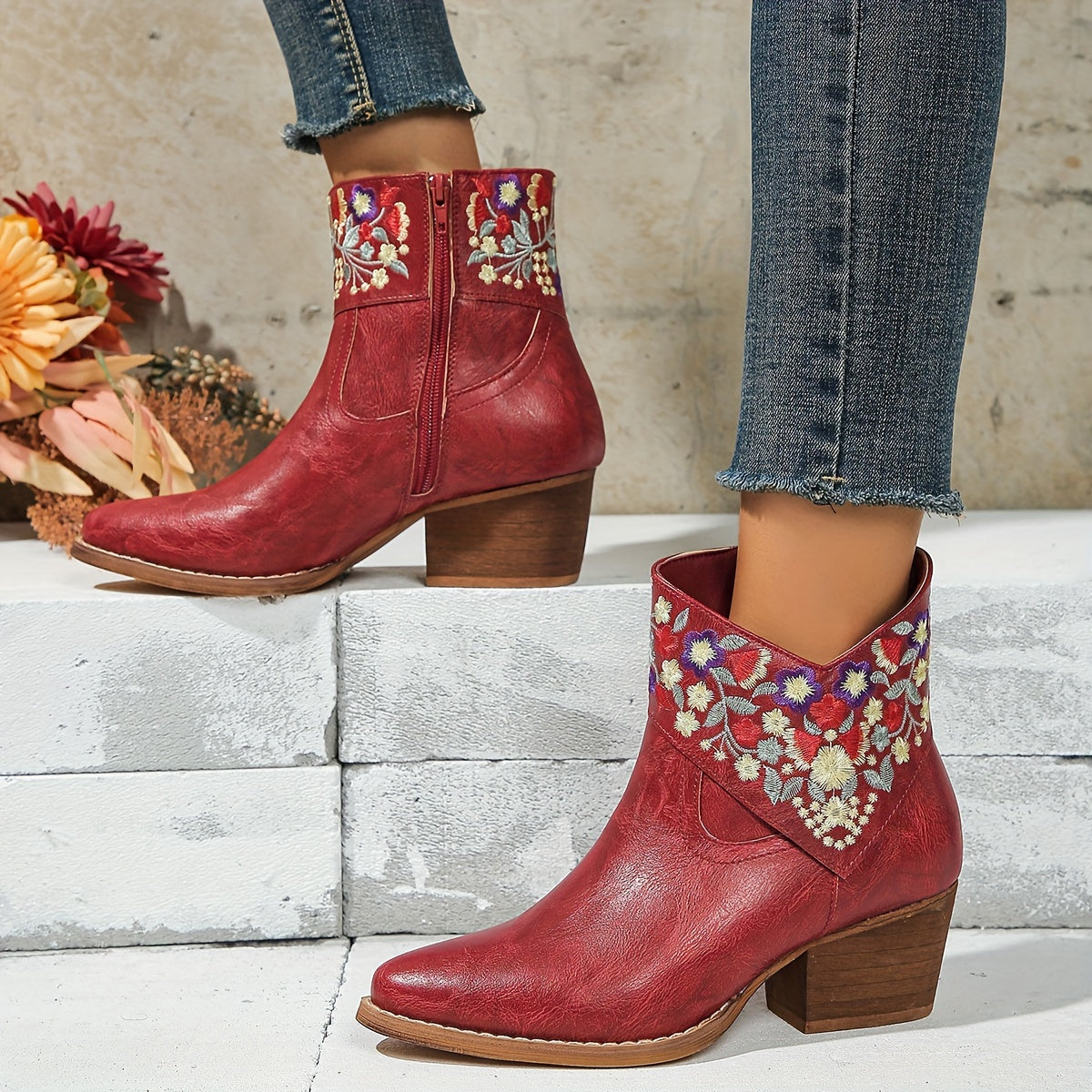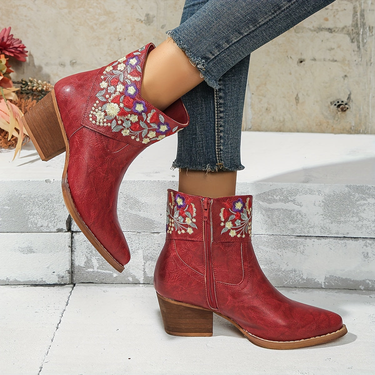 Women's Flower Pattern Chunky Heel Short Boots Leather Point Toe Ankle Zipper