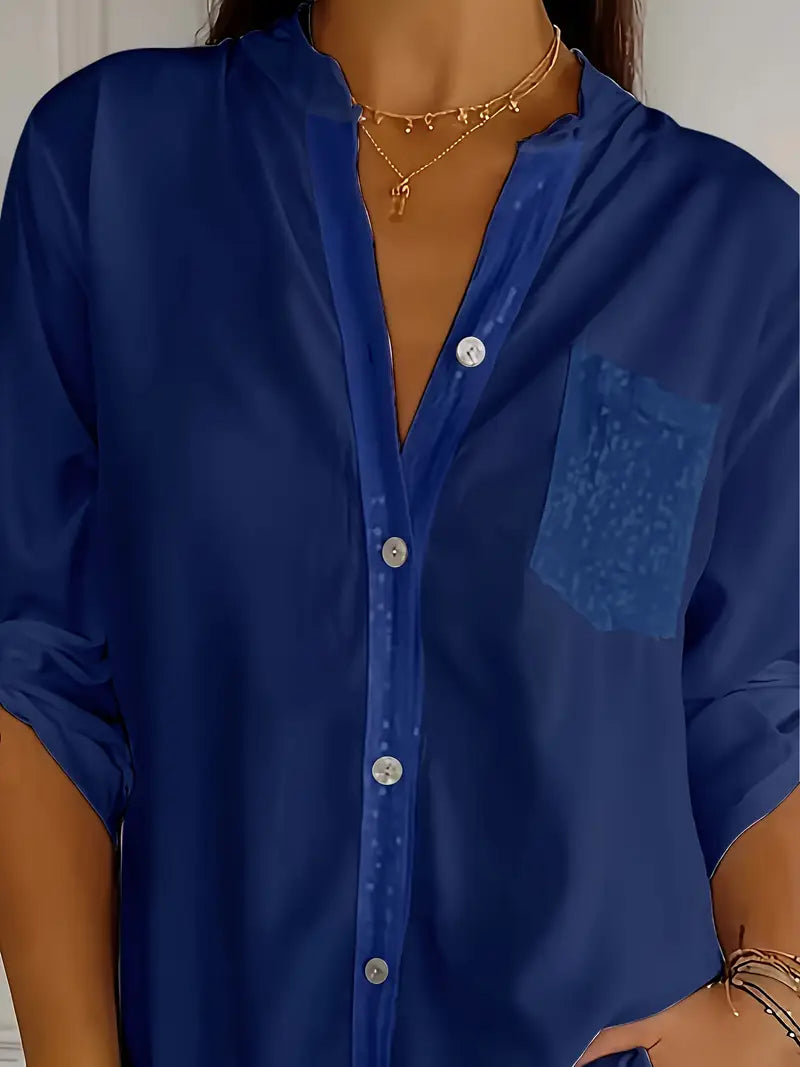 Women's Polyester Long-Sleeve Button-Up Shirt with Patch Pockets Casual All-Season