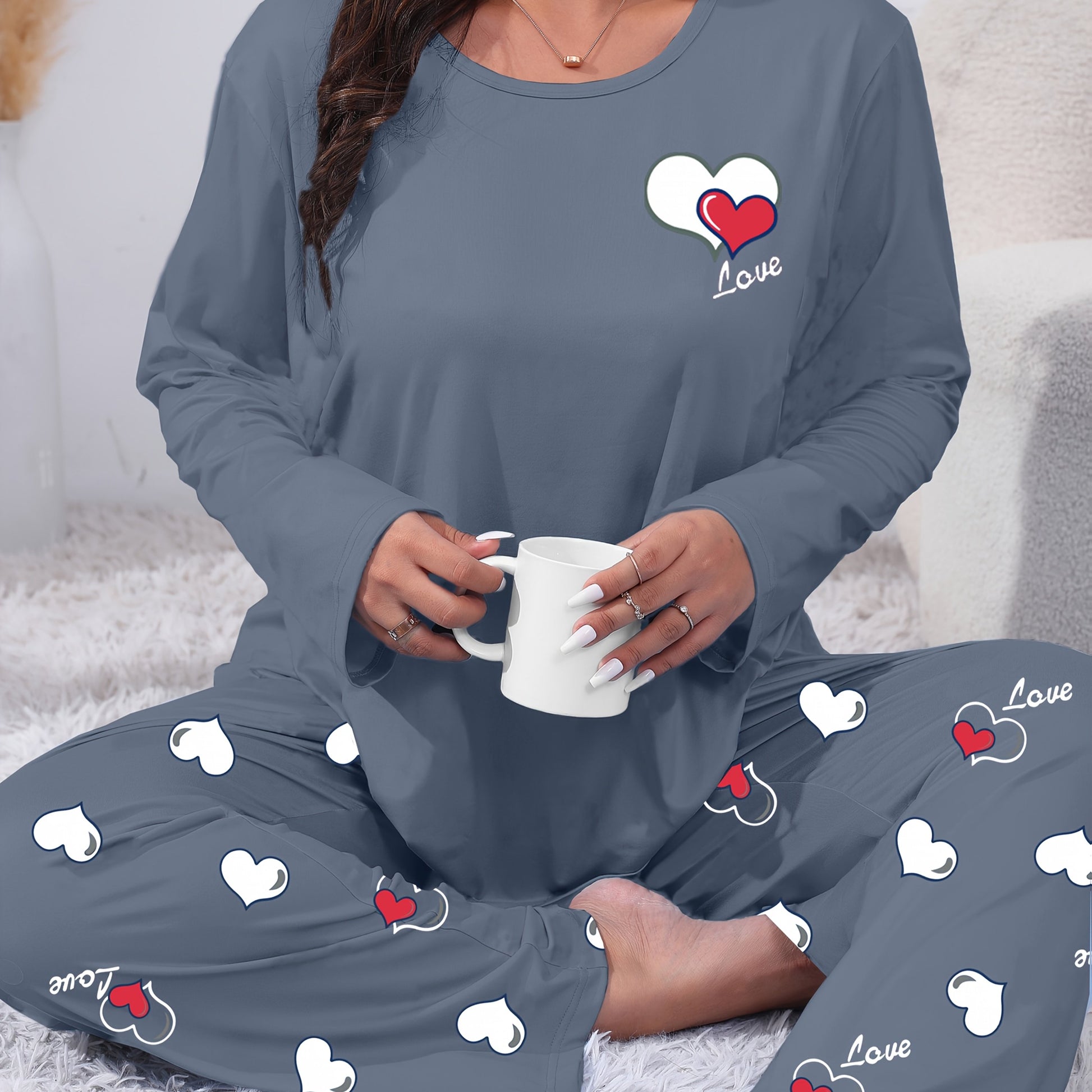 Women's Plus Size Love Heart Print Pajama Set Long Sleeve Sleepwear Soft Polyester Lounge