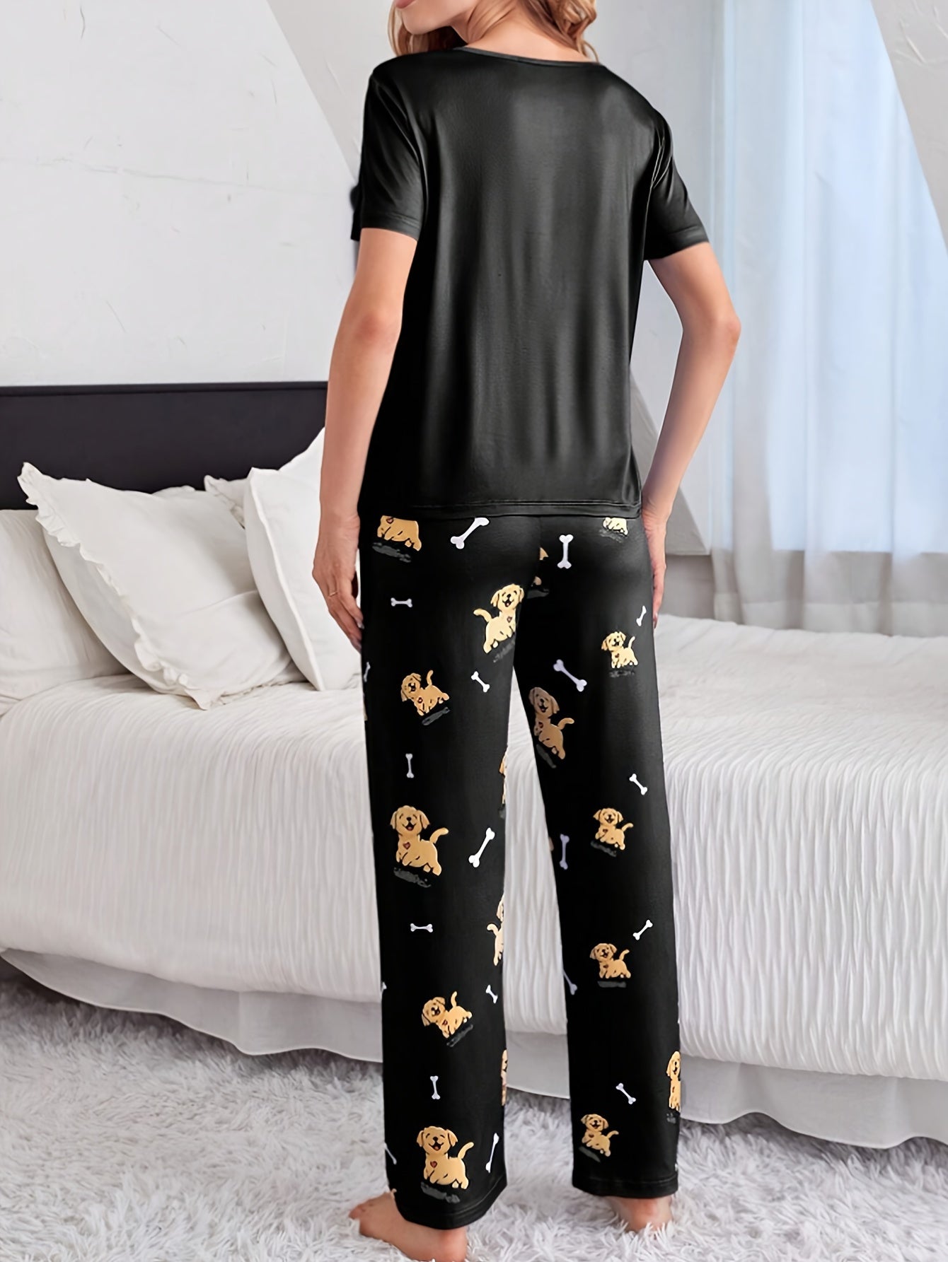 Women's Sleepwear Set with Puppy Print Short Sleeve Top and Elastic Pants