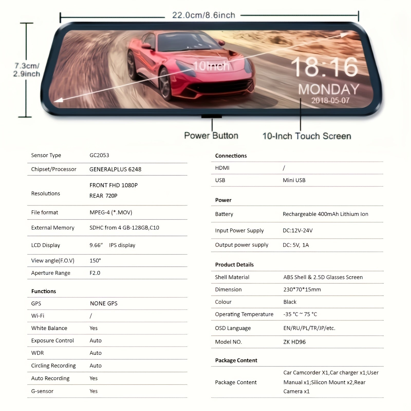 1080P Front and 720P Rear Camera Mirror Dash Cam Touch Screen Magnetic Mount Rechargeable Battery