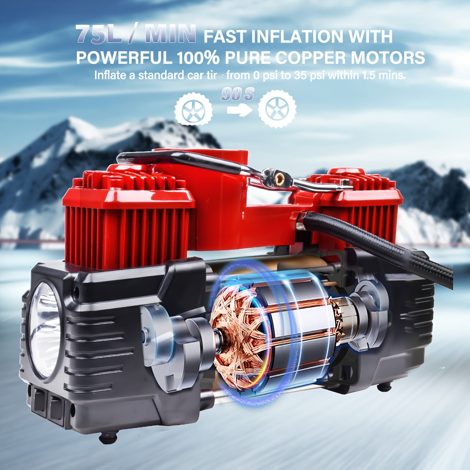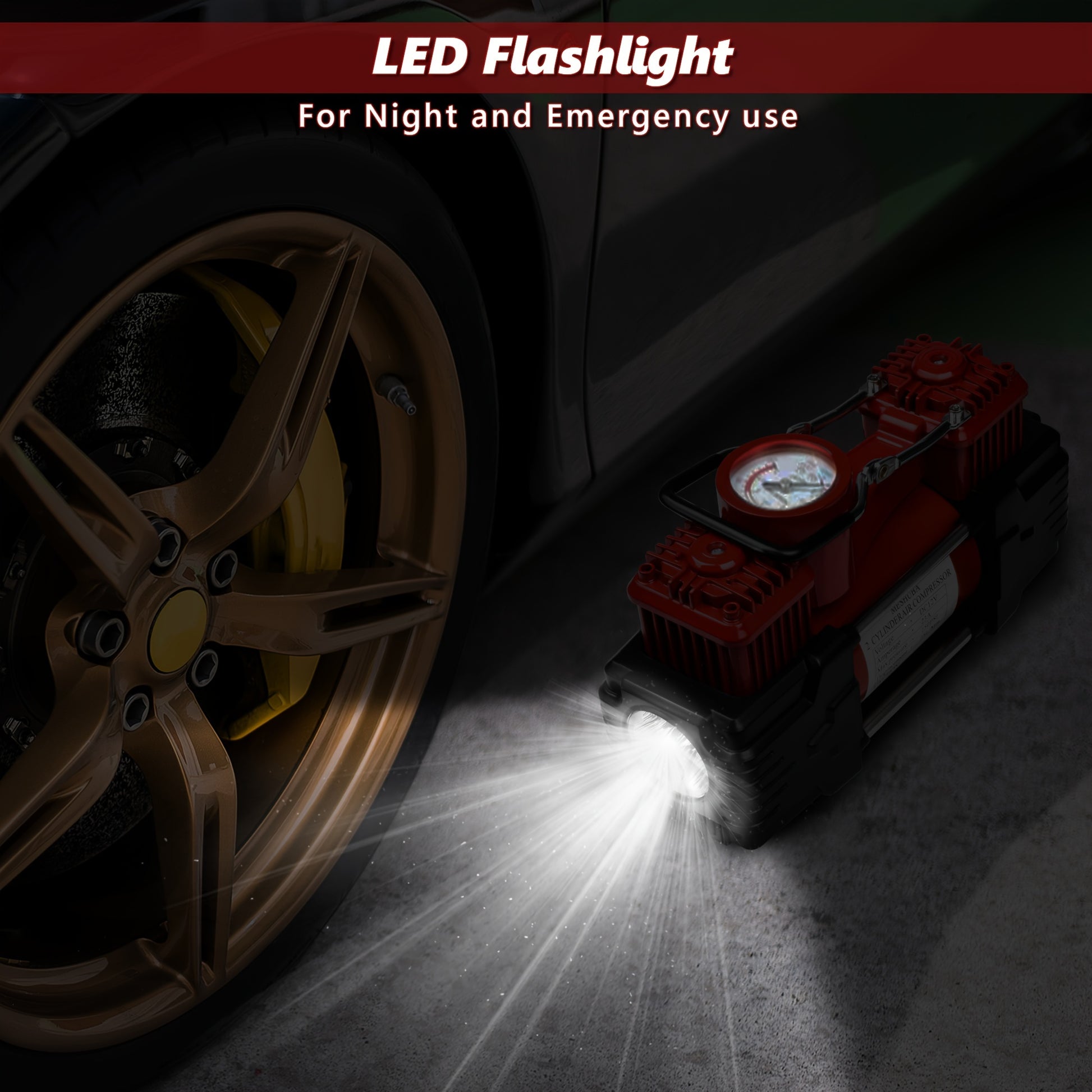 12V Twin Cylinder Air Compressor for Vehicles Bicycles with Accurate Gauge and Emergency Light