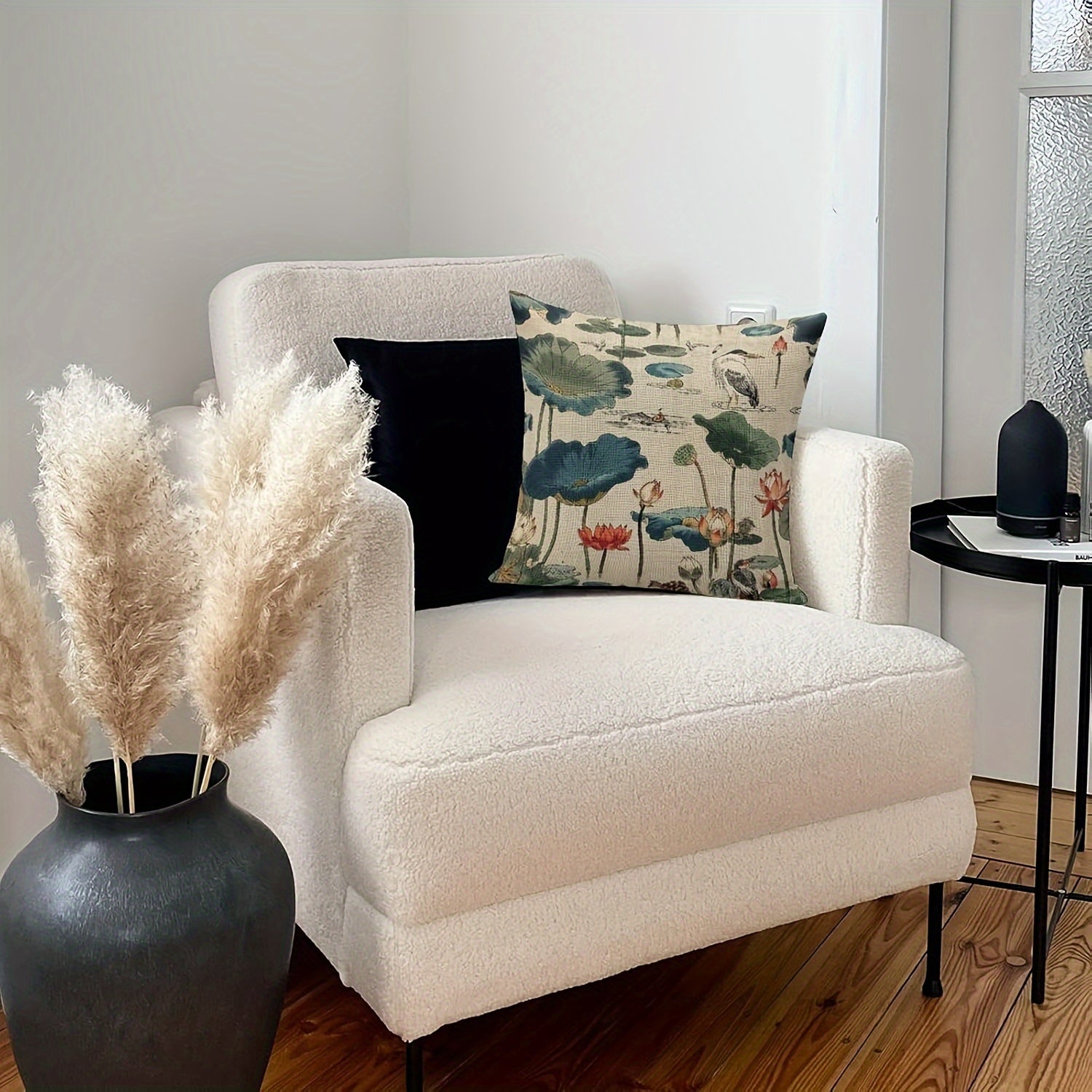 18x18 Linen Throw Pillow Cover with Birds and Lotus Print, Machine Washable, Zipper Closure