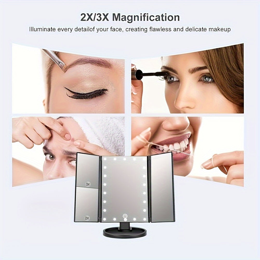 LED Lighted Vanity Makeup Mirror with 2X and 3X Magnification, Touch Control, Trifold Design, Dual Power USB Battery