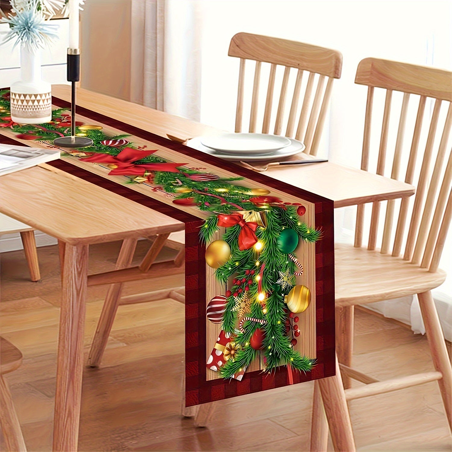 Linen Christmas Table Runner with Buffalo Plaid Merry Christmas Ball Pattern