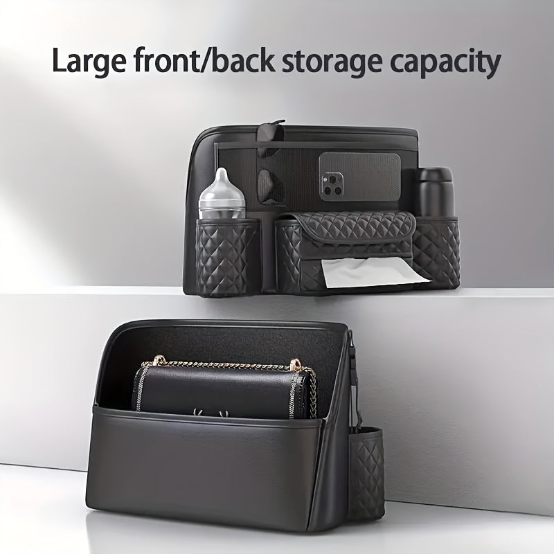 PU Leather Car Seat Back Organizer with Multi-Pocket Storage Waterproof Durable Black Quilted