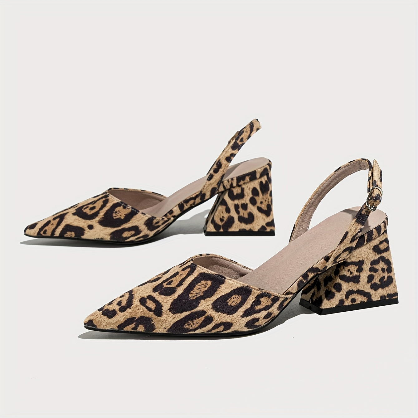 Women's Brown Leopard Print Block Heel Sandals with Pointed Toe and Mid Heel