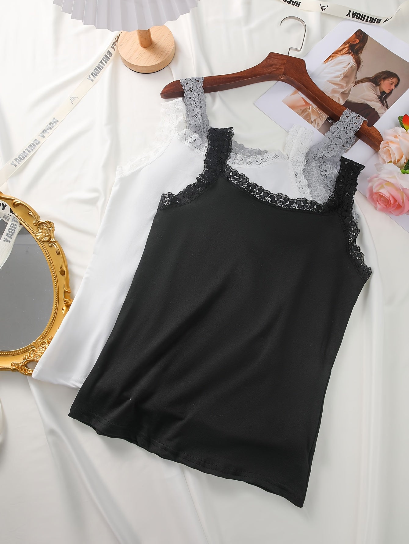 Women's Lace Trim Cami Top in Pink and Beige Breathable Nylon Elastane Blend