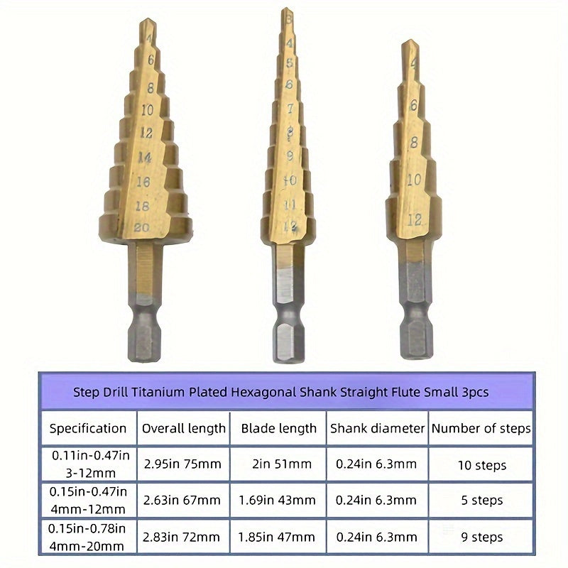 3pcs Titanium Coated High Speed Steel Step Drill Set for Wood Metal