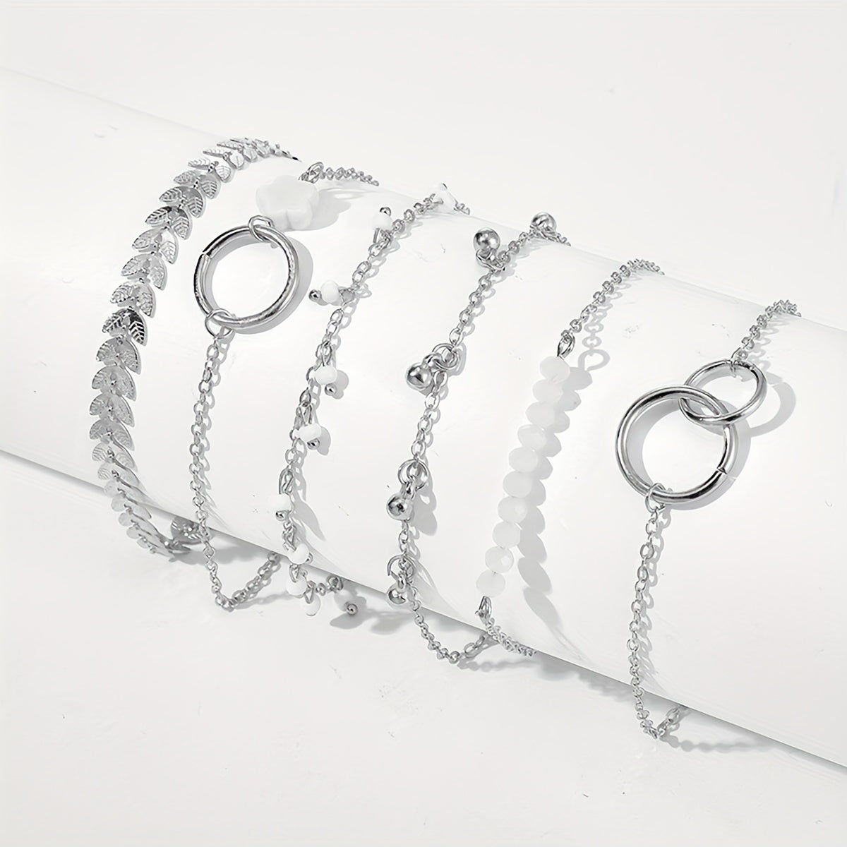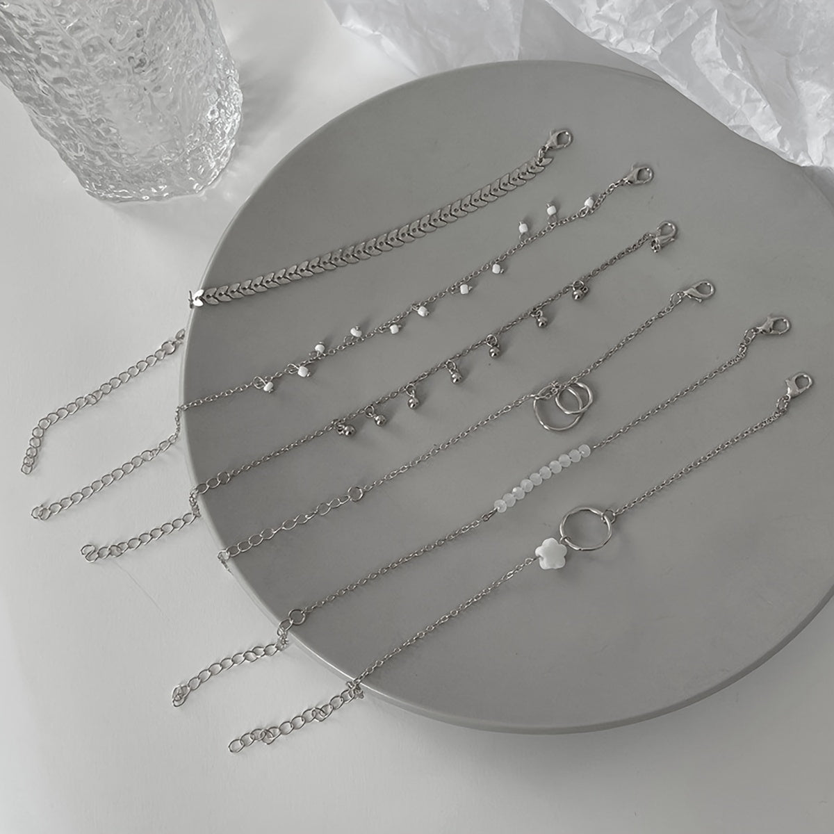 6-Piece Gold Retro Anklet Set with Flower Tassel Tree Leaf Geometric Pendants for Girls