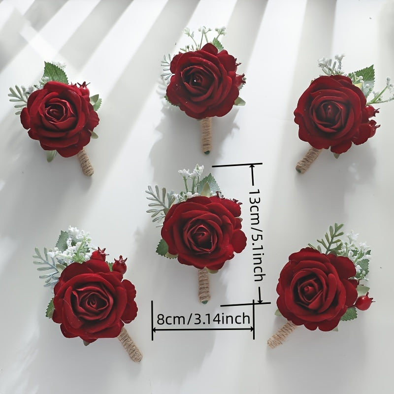 6-Piece Red Artificial Rose Wedding Boutonnieres for Bridal Party Groomsmen Prom Decorations