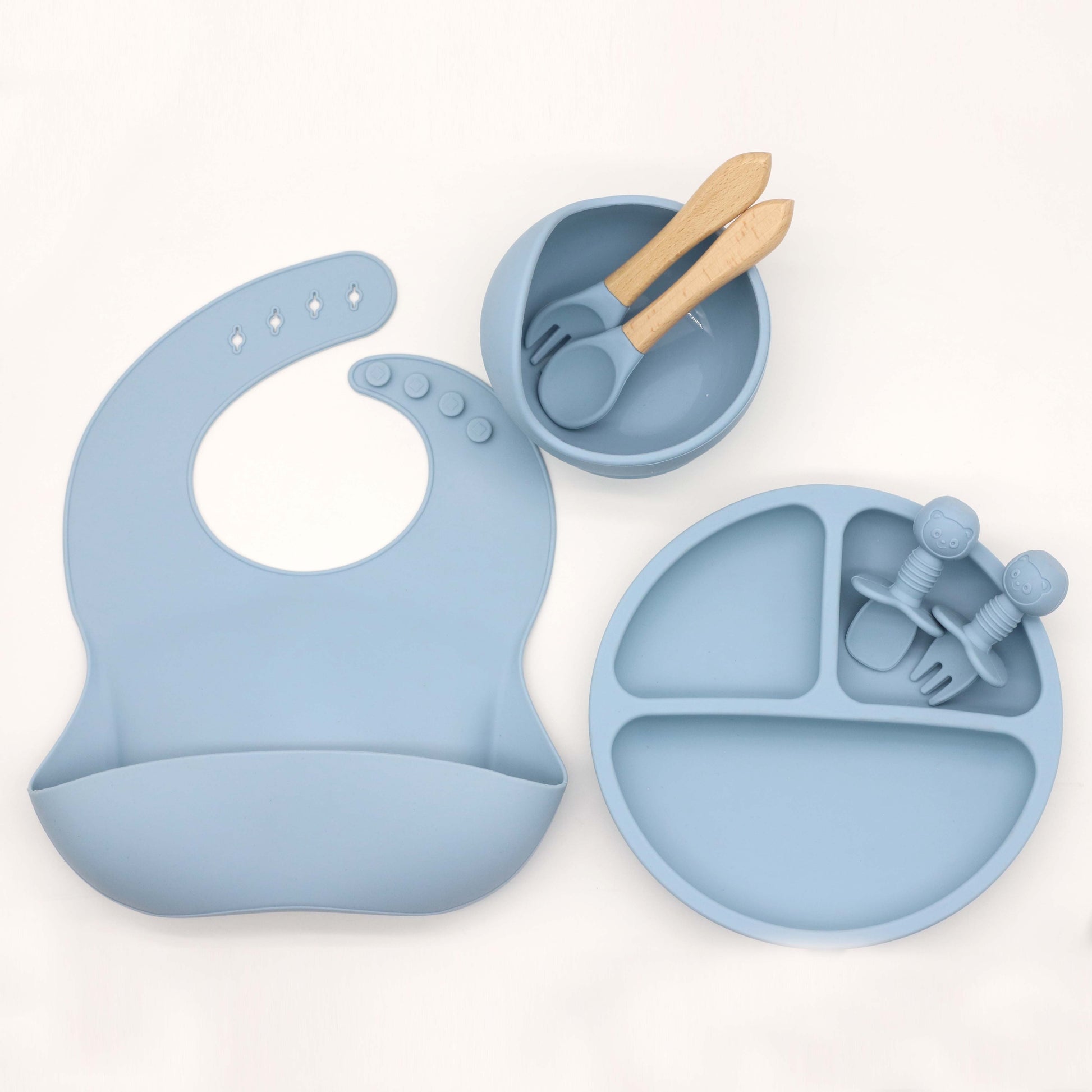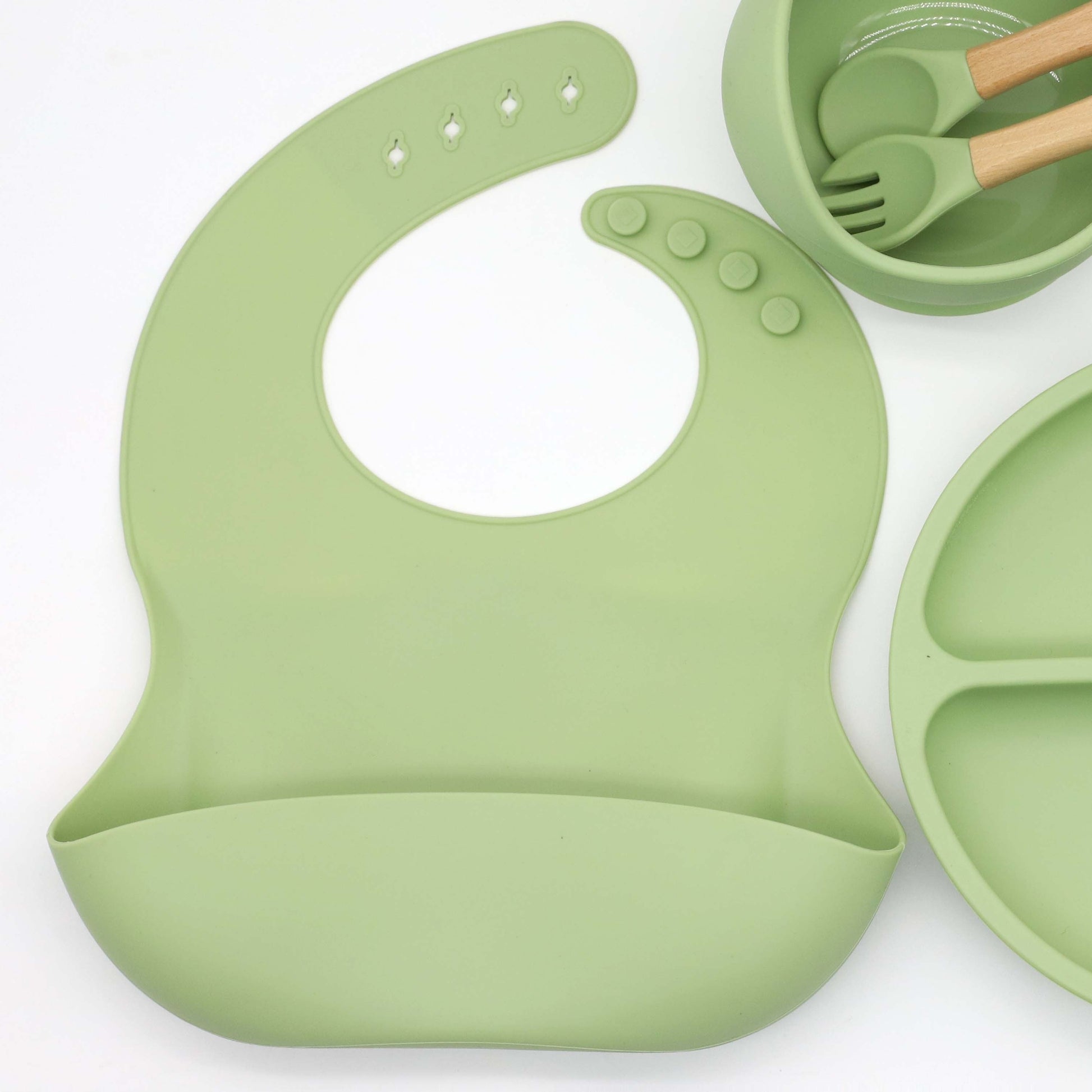7-Piece Silicone Baby Utensils Set with Bowl Plate and Wooden Handle Spoons Forks Green