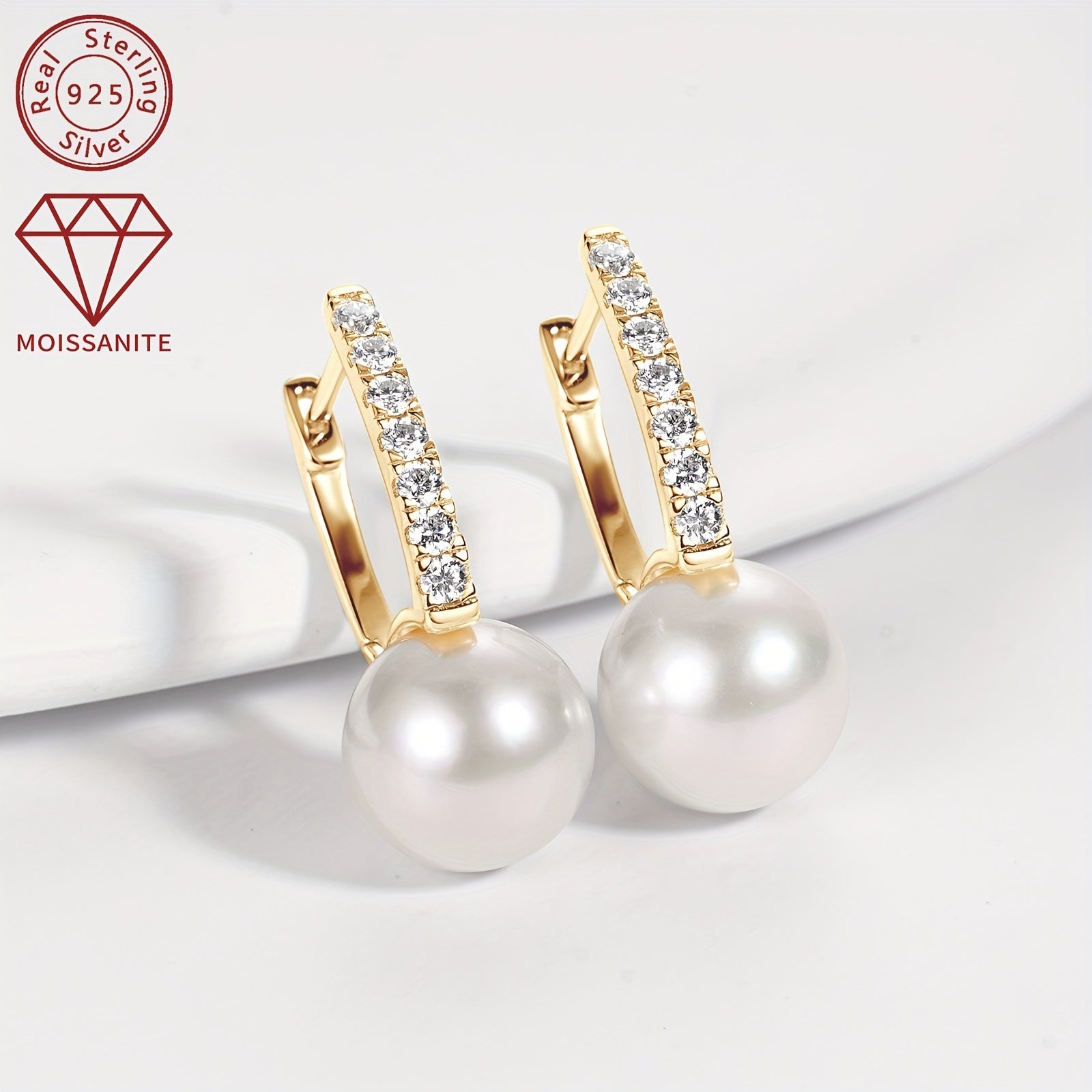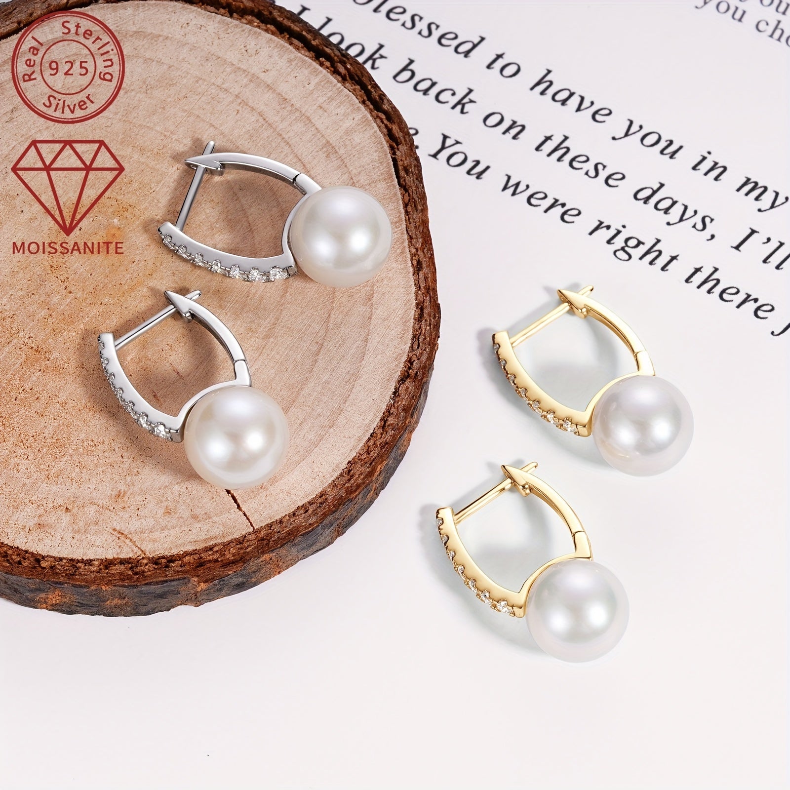 Women's Silver Pearl Earrings with Moissanite 9.5-10mm Freshwater White Pearls