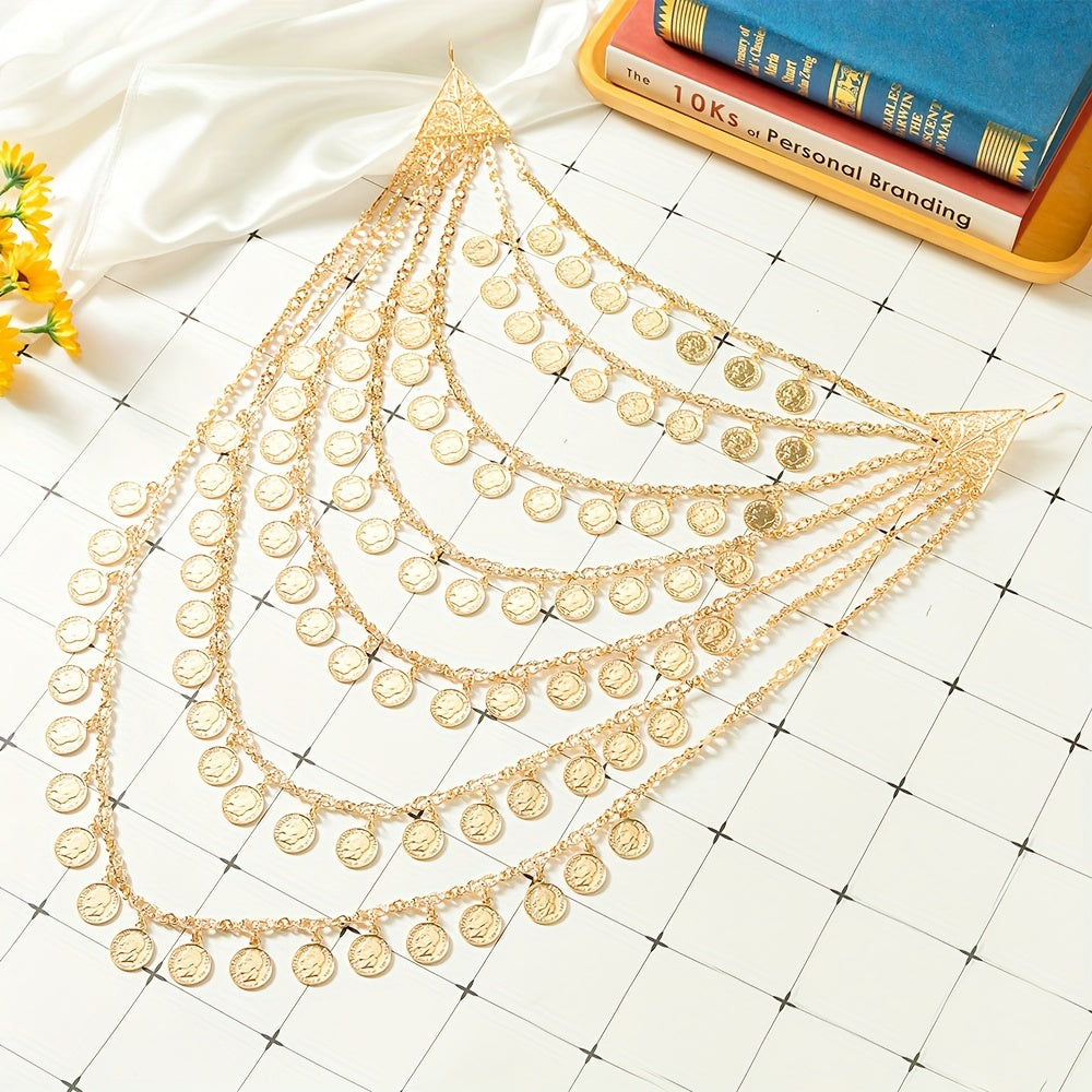 Gold Plated Arabic Bride Chest Chain with Handmade Coin Links for Wedding Jewelry