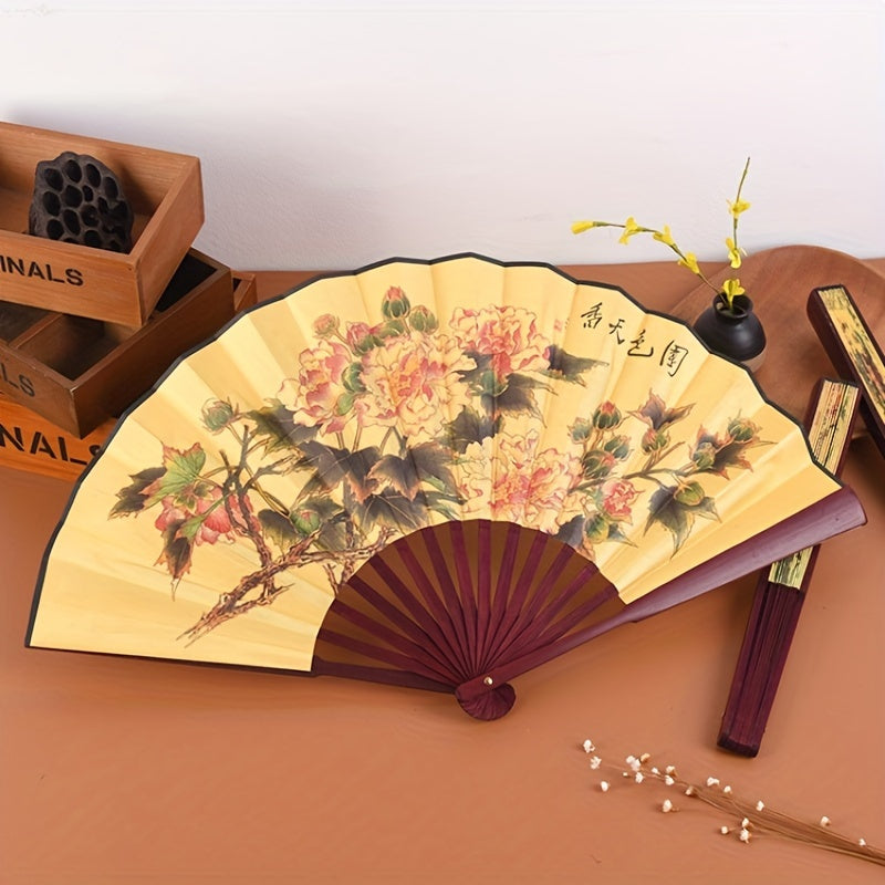 Ancient Style Chinese Folding Fan with Peony Plum Eight Jun Artwork 8-Inch