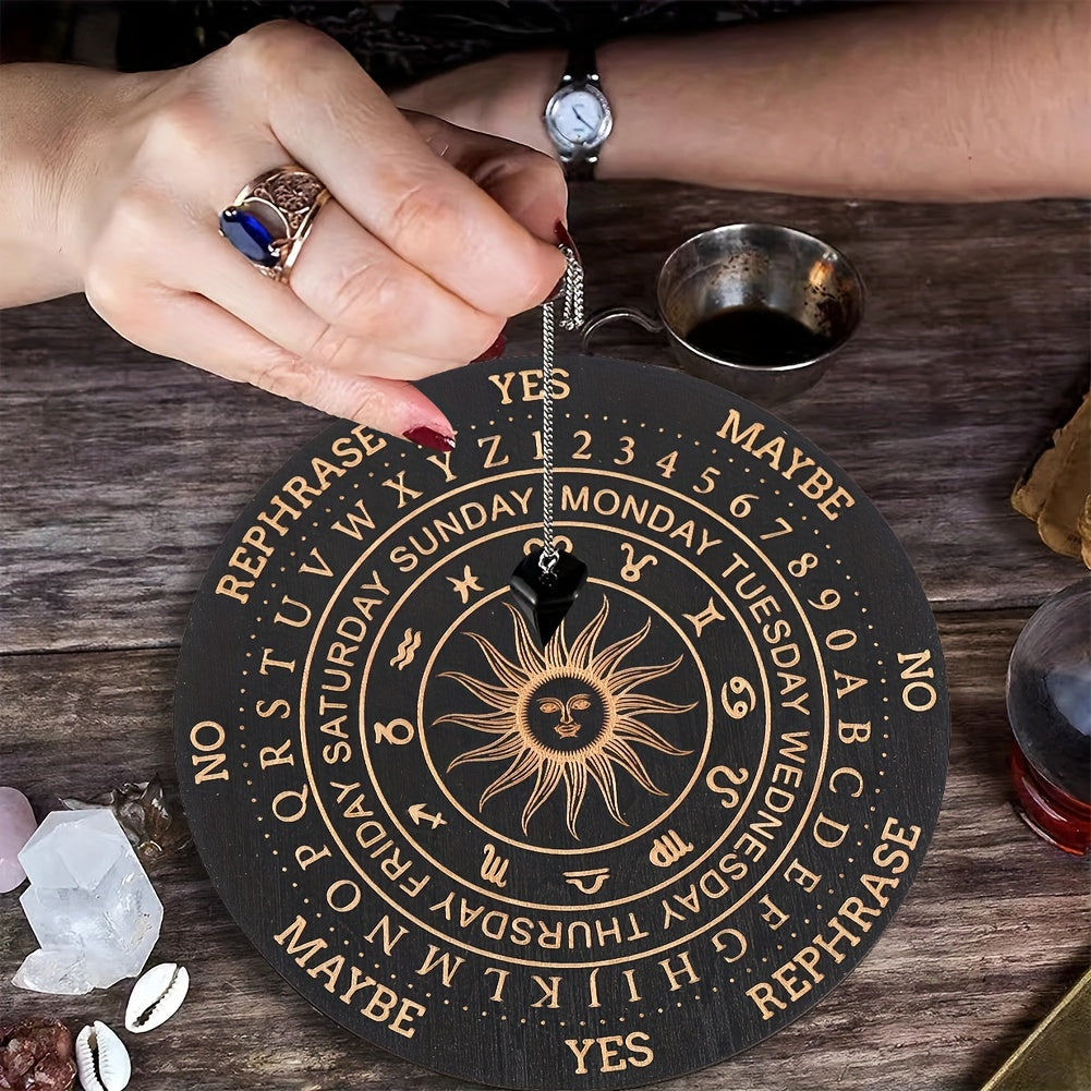 Art Deco Wooden Divination Meditation Coaster with Zodiac Sun Pendulum Board and Crystal Stand