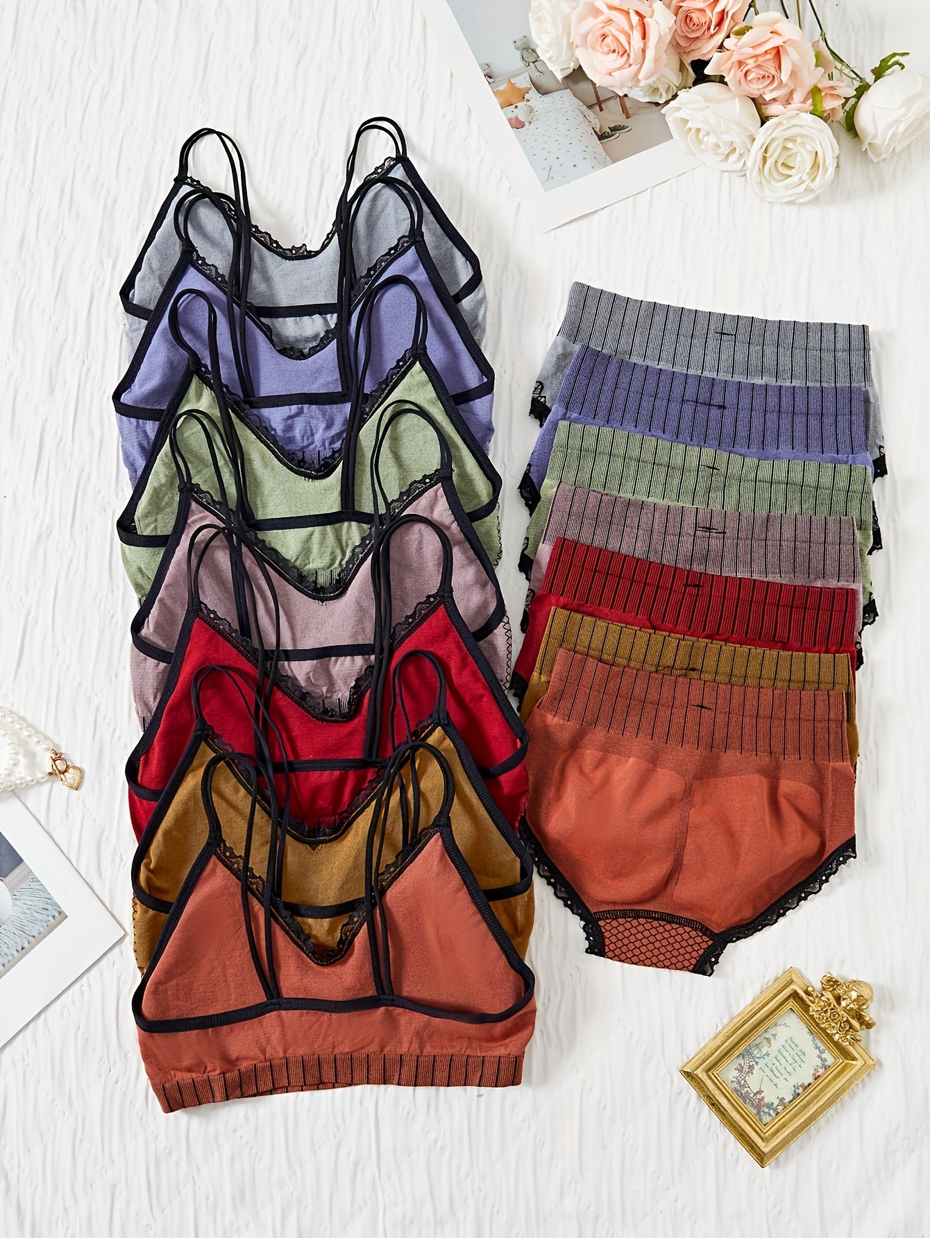 Women’s Baroque Style Lingerie Set with Removable Pads and Mid-Rise Briefs in 7 Color Pack