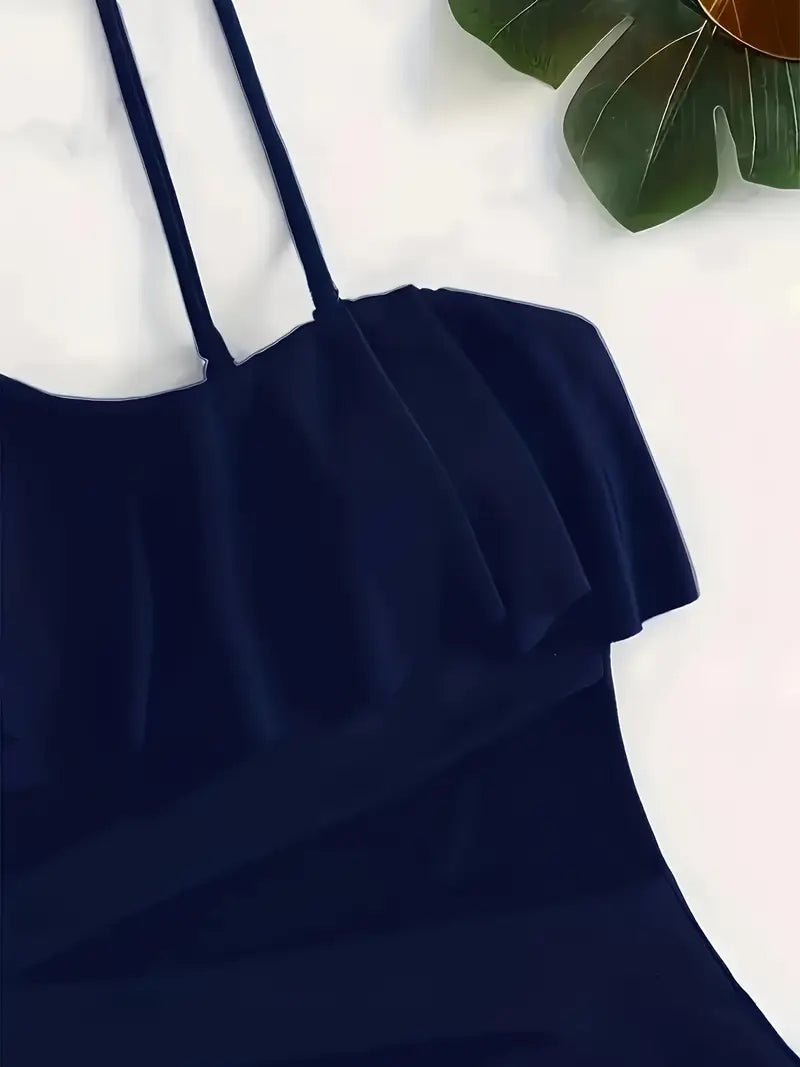 Women's Black One-Piece Swimsuit with One-Shoulder Mesh and Ruffle Details