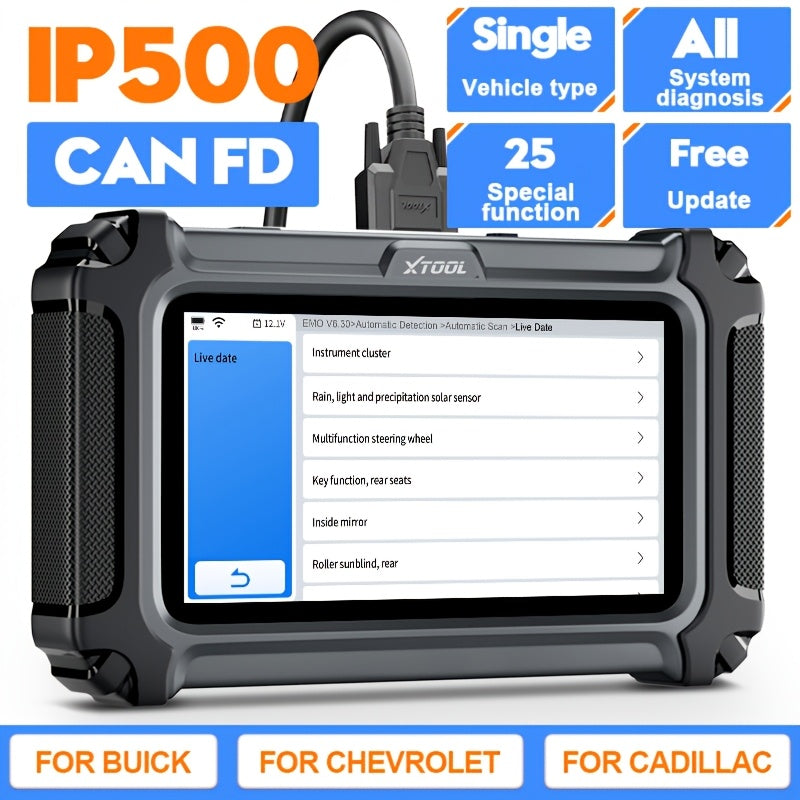 Notice for Purchases Before you make an order, kindly reach out to our customer service with details about your vehicle's model, year, and specific needs. We will: ️√ Verify product compatibility at no charge √ Suggest more appropriate options Click on Customer Service Consultation for personalized professional assistance!This is a gentle reminder: The primary language set on this device is English. If you wish to change it to a different language, kindly provide the serial number (S/N) located on the back of the product to our customer service team after your purchase, and indicate the language you prefer. We will handle your request promptly.The latest XTOOL InPlus IP500 OBD2 automotive scanner for Buick, Chevrolet, Cadillac, and GMC vehicles is set to launch in 2025. This new version features a 5-inch display and offers comprehensive system diagnostics, supports all OBD2 modes, provides full bidirectional control, and includes complete reset services along with 25 special functions. It is equipped with a built-in CAN FD protocol, offers lifetime free updates, and supports over 15 languages.The OE Full System Diagnostic is a thorough diagnostic service intended for GM brands, including Chevrolet, GMC, Buick, and Cadillac. The XTOOL IP500 automotive scanner tools offer diagnostic capabilities equivalent to those utilized by manufacturers in their service facilities, allowing extensive access to the vehicle's systems.Engine and Powertrain: Identifies problems concerning engine efficiency, fuel delivery, transmission, and drivetrain parts. Transmission System: Observes gear change patterns, transmission fluid amounts, and additional performance metrics. ABS and Braking Systems: Conducts thorough diagnostics on the Anti-lock Braking System (ABS), electronic brake distribution, and emergency braking functionalities.SRS: Offers details about airbag activation systems, enabling inspections of vital safety elements like impact sensors and airbag units. Suspension System: Oversees electronically managed suspension systems, including GM's Magnetic Ride Control, to guarantee the best ride experience.Comprehensive Two-Way Control & Live Testing XTOOL IP500 two-way diagnostic tools for Chevrolet, GMC, Buick, and Cadillac vehicles enable users to issue commands and gather data from multiple electronic control units (ECUs), improving the efficiency of vehicle diagnostics and repairs, allowing technicians to conduct various tests and modifications across different systems. Live Testing encompasses:Testing fuel injectors, activating the cooling fan, turning on the fuel pump, adjusting the power seat, operating the wipers, testing the horn, locking the doors, adjusting the power mirrors, controlling the turn signals, switching the headlights, activating the brake lights, turning on the air conditioning compressor, controlling the blower motor, activating the electronic parking brake, operating the sunroof, testing the throttle body, adjusting the idle control valve, testing the window up/down function, releasing the trunk, testing the exhaust valve, activating the tire pressure monitoring system.Complete complimentary reset services for GM brands. The XTOOL IP500-BCC automotive scanner provides an extensive range of reset functions at no extra charge for Chevrolet, GMC, Buick, and Cadillac. These services aim to help vehicle owners and technicians efficiently handle regular maintenance, repairs, and system adjustments.In addition, the XTOOL IP500 car diagnostic tool is equipped with 25 frequently used special functions, such as: Oil Light Reset, EPB, SAS, DPF, BMS Reset, Throttle, ABS Bleeding, Injector Coding, Gearbox Match, Suspension, Language Change, Transport Mode, VGT Relearn, Window Initialization, Seat Calibration, Headlight, Nox Reset, A/F Reset, A/C Relearn, EGR Relearn, Rain/Light Sensor, Clutch Adaptation, Tire Size Reset, Power Balance, and Crank Sensor Relearn.XTOOL IP500 Car Diagnostic Scanner: More Affordable Features 1. Automatic VIN Detection & Scanning The XTOOL IP500 scanner can automatically recognize the vehicle's VIN and conduct a thorough scan of all accessible systems. By determining the exact make and model of the vehicle, this tool can customize its diagnostics to deliver precise and pertinent information.The XTOOL IP500 smart scanner provides a 4 in 1 live data graph feature, allowing users to view various data parameters at the same time in a visual format. This facilitates real-time observation of essential metrics related to engine and vehicle performance, including RPM, speed, coolant temperature, and fuel trim levels.The XTOOL IP500 bidirectional scanner tool encompasses comprehensive OBD2 diagnostic functions, which include: 1. Reading fault codes, 2. Clearing fault codes, 3. Accessing live data, 4. Viewing freeze frame data, 5. Checking I/M readiness status, 6. On-board monitor (Mode 6), 7. O2 sensor testing, 8. Component tests (Mode 8), 9. Vehicle information, and 10. DTC lookup. Additionally, it is not restricted to GM vehicles only.The XTOOL IP500 car diagnostic scanner enables users to effortlessly create and distribute diagnostic reports to coworkers or clients. Once a scan is completed, users can store the findings as a comprehensive report, which can subsequently be shared through email or various communication channels.5. Free Updates for Life XTOOL IP500 automotive diagnostic equipment for GM guarantees that users can consistently access the most recent software improvements, error corrections, and updates for the XTOOL IP500 scanner. This allows users to maintain their diagnostic tool up-to-date with the newest vehicle models and technologies without facing extra charges.The XTOOL IP500 supports 15 languages and has no IP restrictions. It is compatible with Buick, Chevrolet, Cadillac, and GMC vehicles, offering 14 languages such as English, Spanish, German, French, Portuguese, Italian, Finnish, Arabic, Japanese, Thai, Korean, Polish, Russian, and Chines