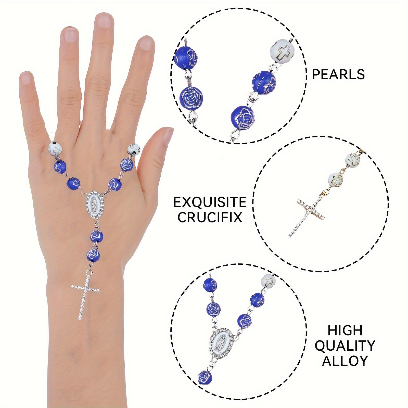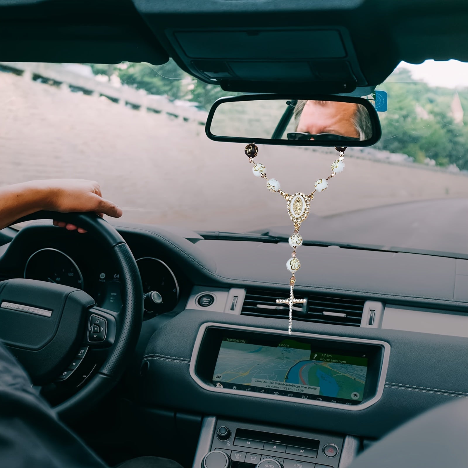 Car Rearview Mirror Beaded Rosary Cross Charm Faux Pearl Alloy Decoration