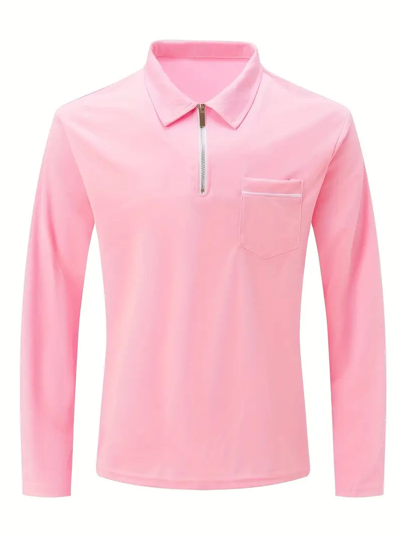 Men's Long Sleeve Solid Zipper Shirt with Lapel Collar and Chest Pocket for Spring Fall Outdoor Wear