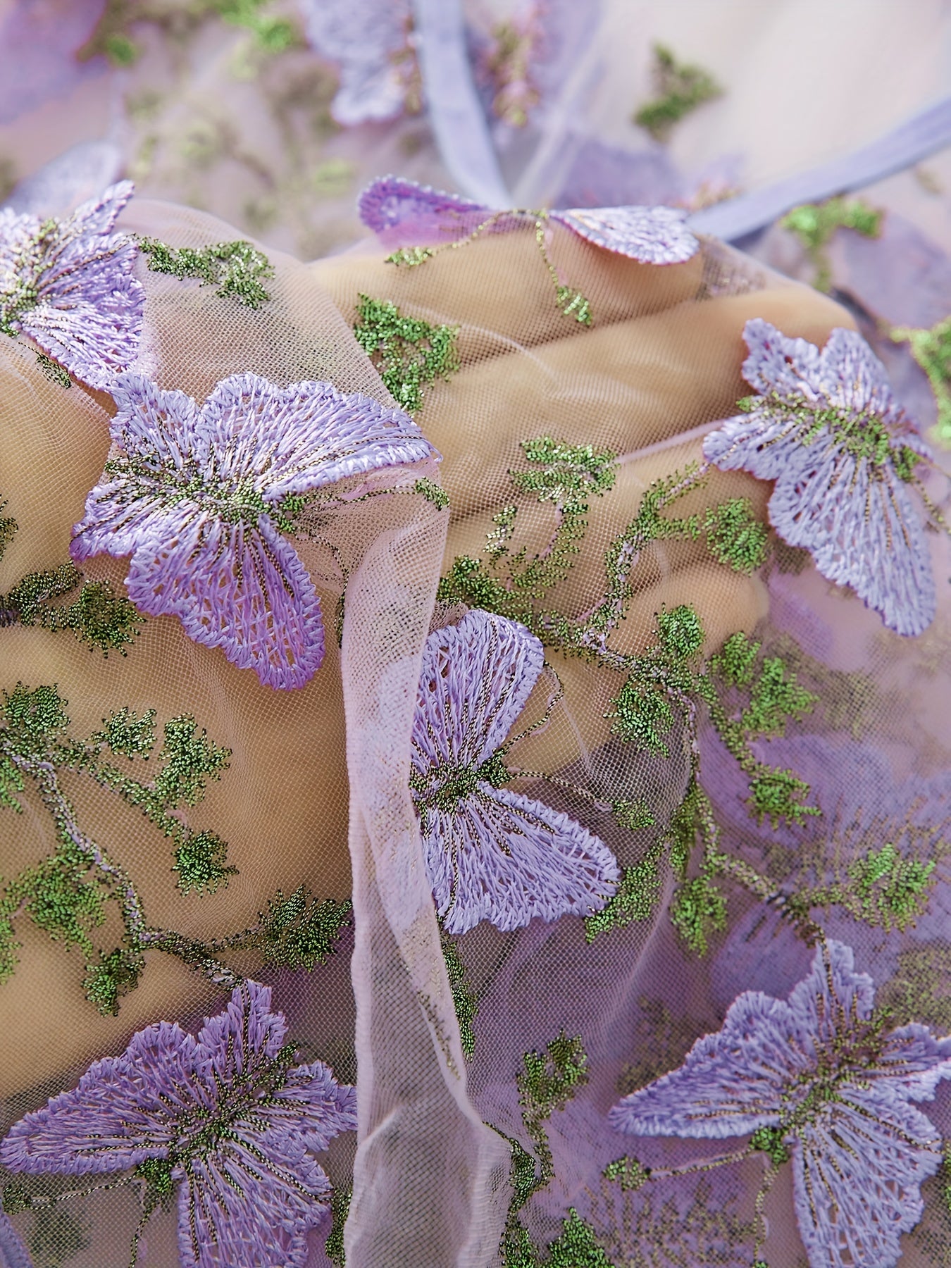 Women's Mesh Lingerie Set with Embroidered Butterfly Details Sheer V-Neck Slip Dress and Thong