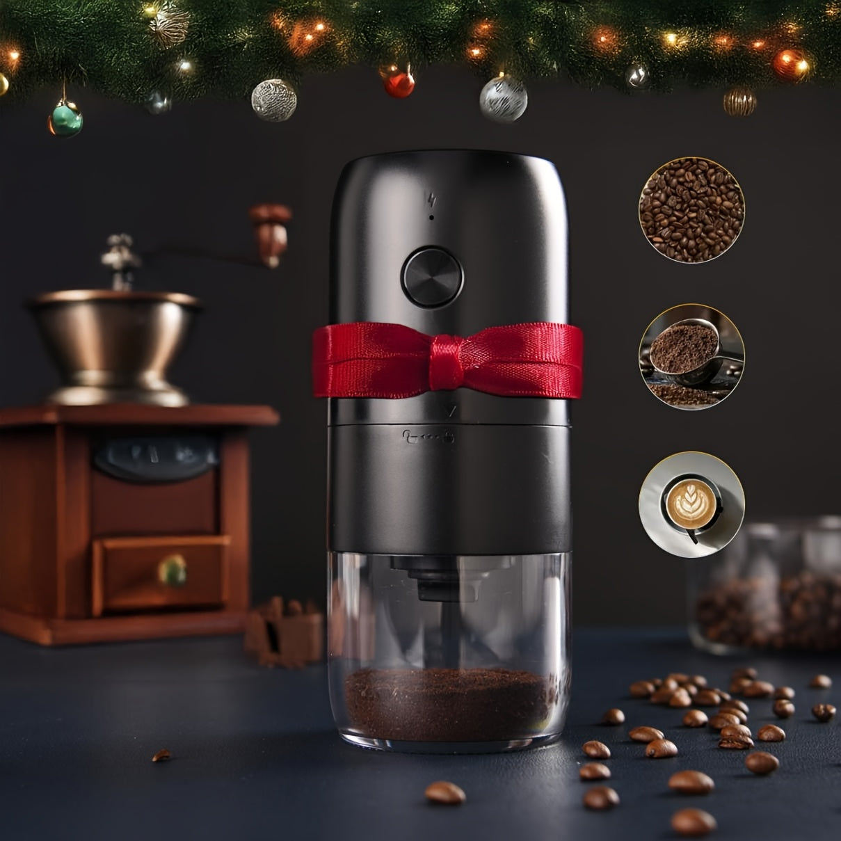 Compact coffee mill with USB charging, adjustable coarseness for grinding coffee, beans, spices for home office travel