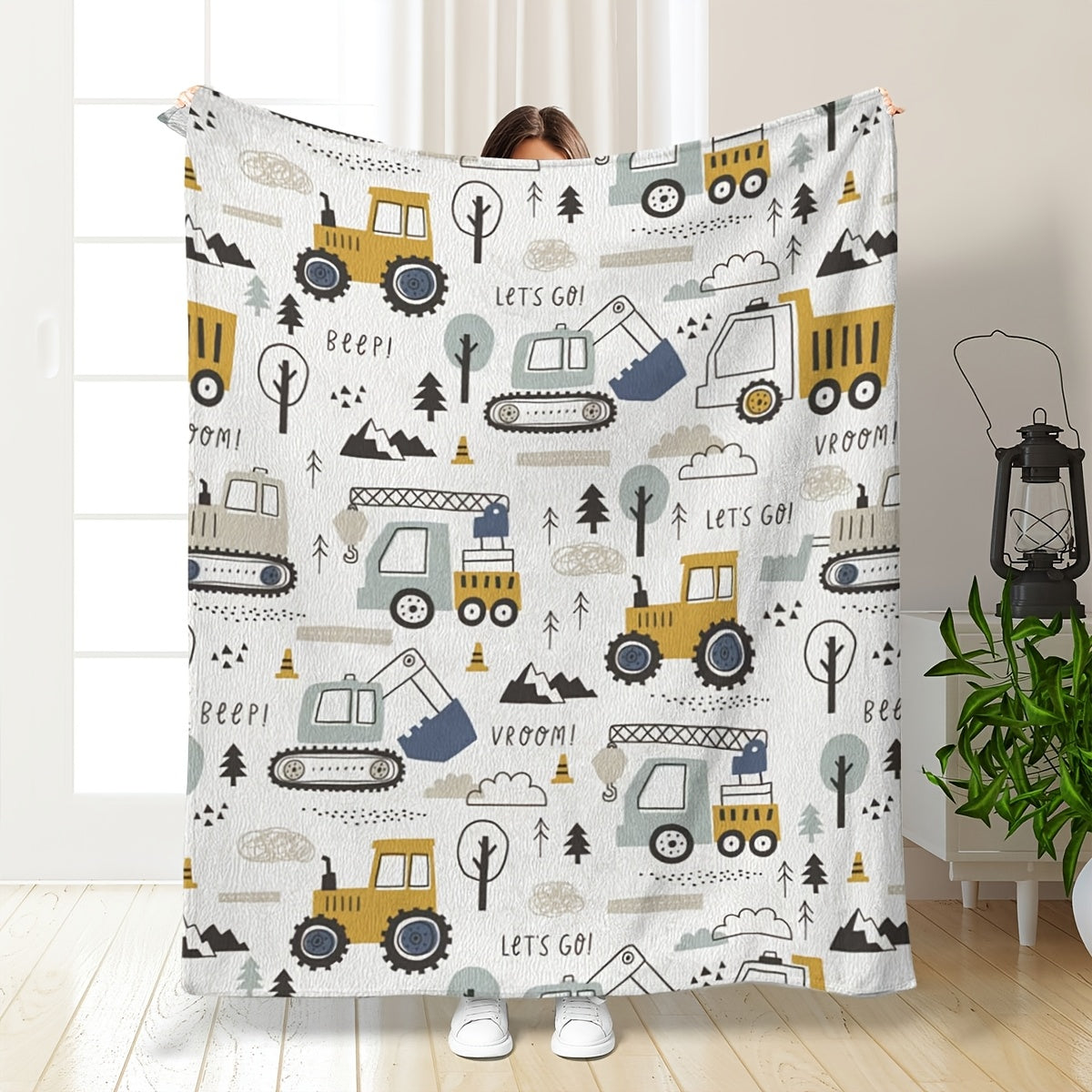 Cartoon Construction Vehicles Flannel Blanket Soft Cozy Lightweight Polyester Fleece