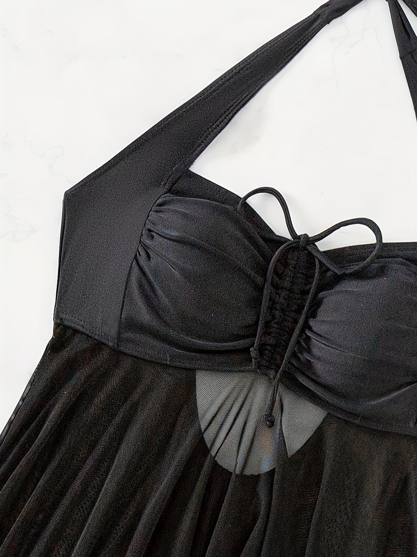 Women's Mesh Tankini Set with Halter Neck and Skirted Boxer Shorts Swimsuit