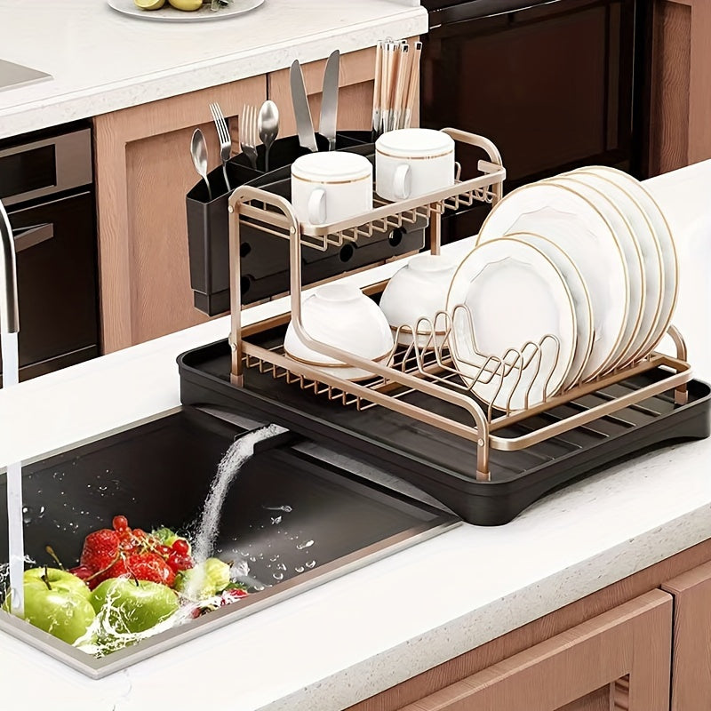 Aluminum Dish Drying Rack with Cutlery Holder Drip Tray Kitchen Organizer