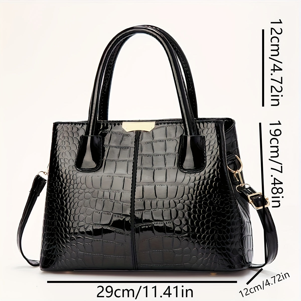 Black Crocodile Pattern Handbag with Adjustable Strap and Zipper Closure