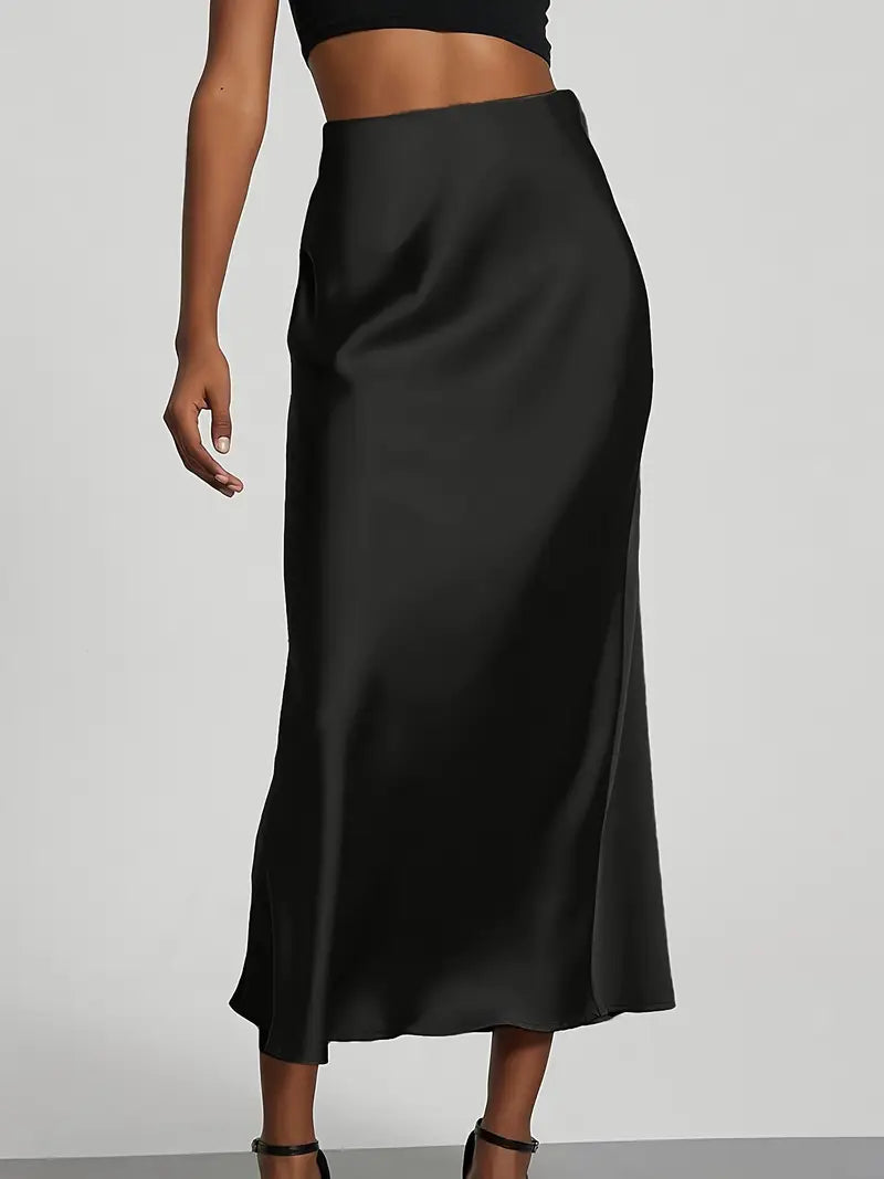 Women's Black Satin High-Waisted Maxi Skirt A-Line Elegant Long Dressy Casual
