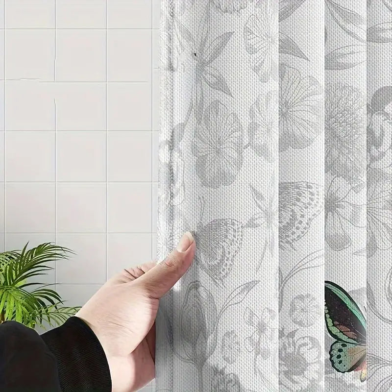 Gray Floral and Butterfly Shower Curtain Polyester Opaque Quick-Dry Machine Washable Easy No-Drill Installation