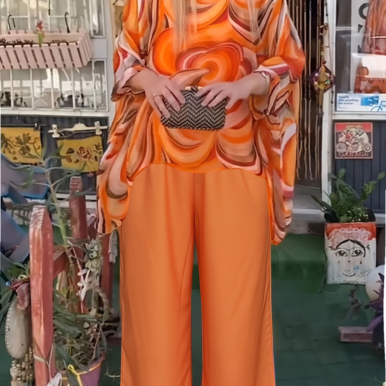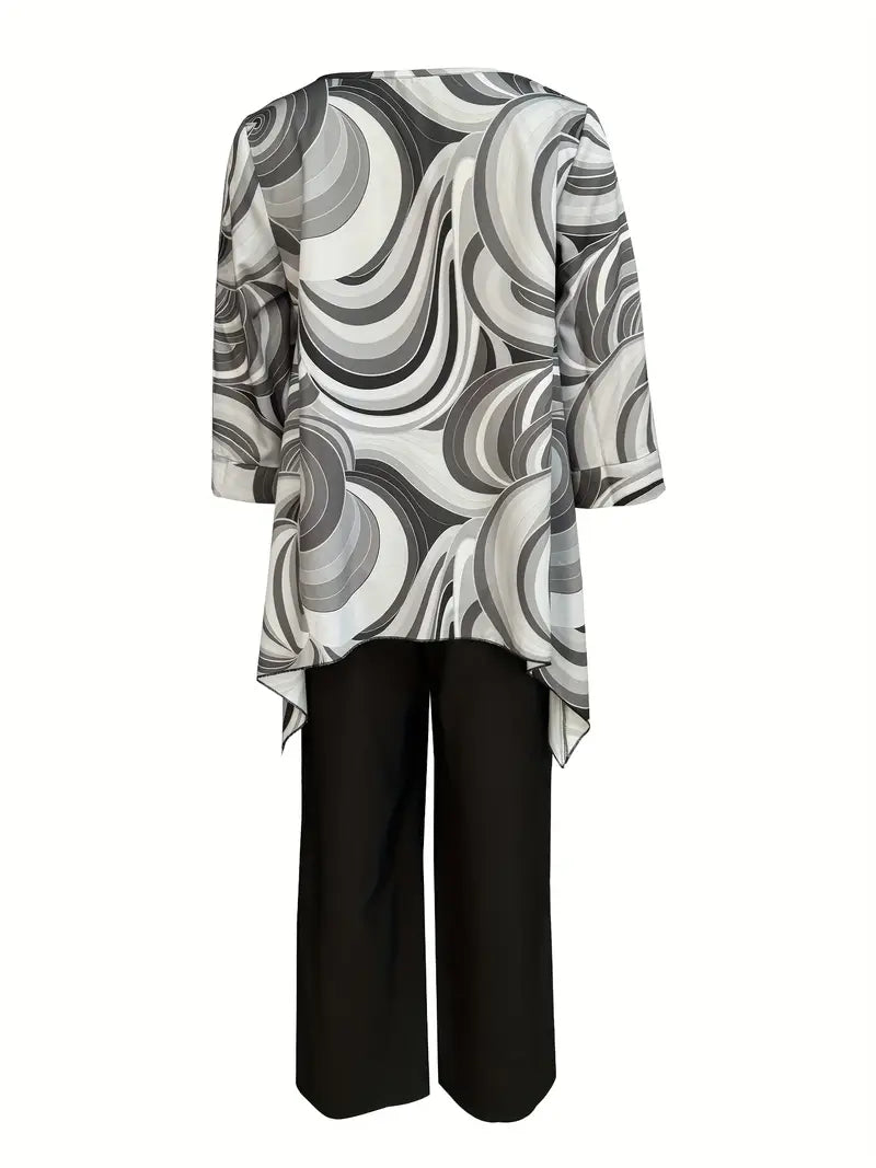 Women's Two-Piece Outfit Abstract Swirl Print Crew Neck Top Black Pants Polyester Blend Spring Summer