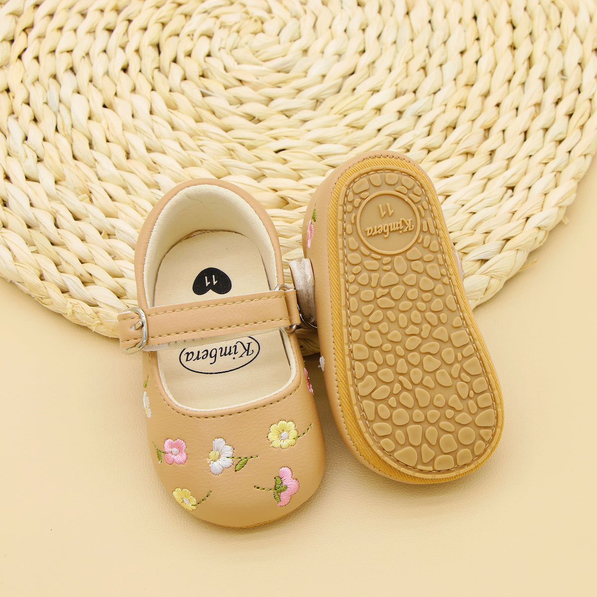Baby Girls Embroidered Flower Mary Jane Shoes Lightweight Non-Slip Flat Sole for Indoor Outdoor Autumn
