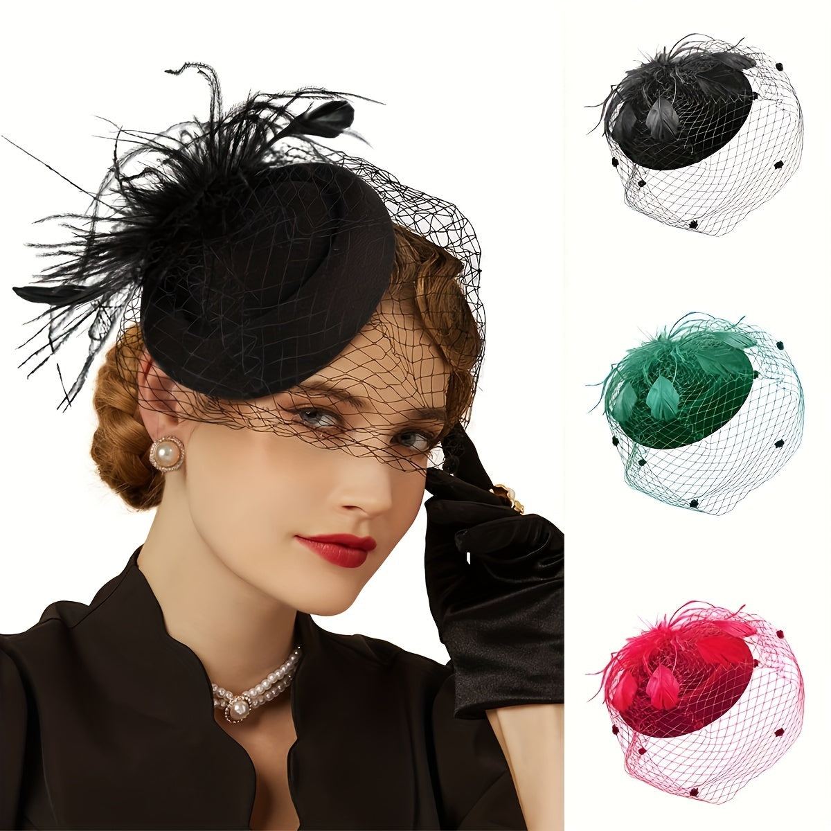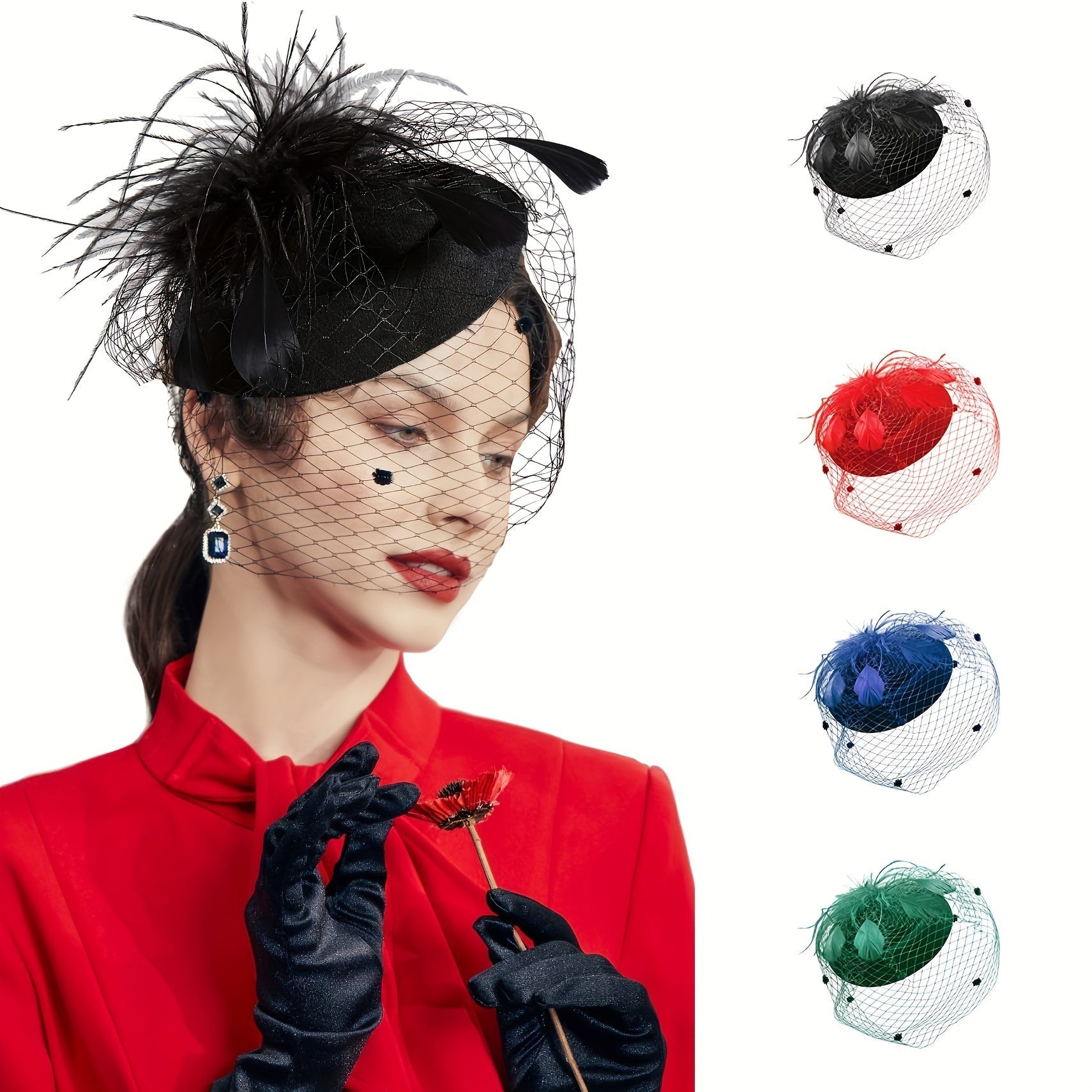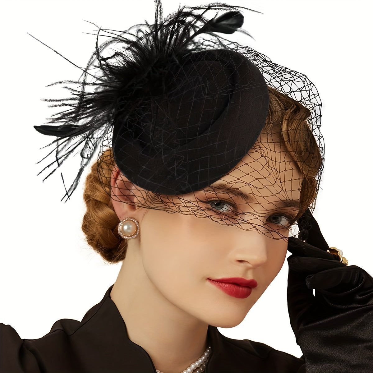 Faux Feather Fascinator Hat with Veil and Hair Clip for Weddings and Tea Parties
