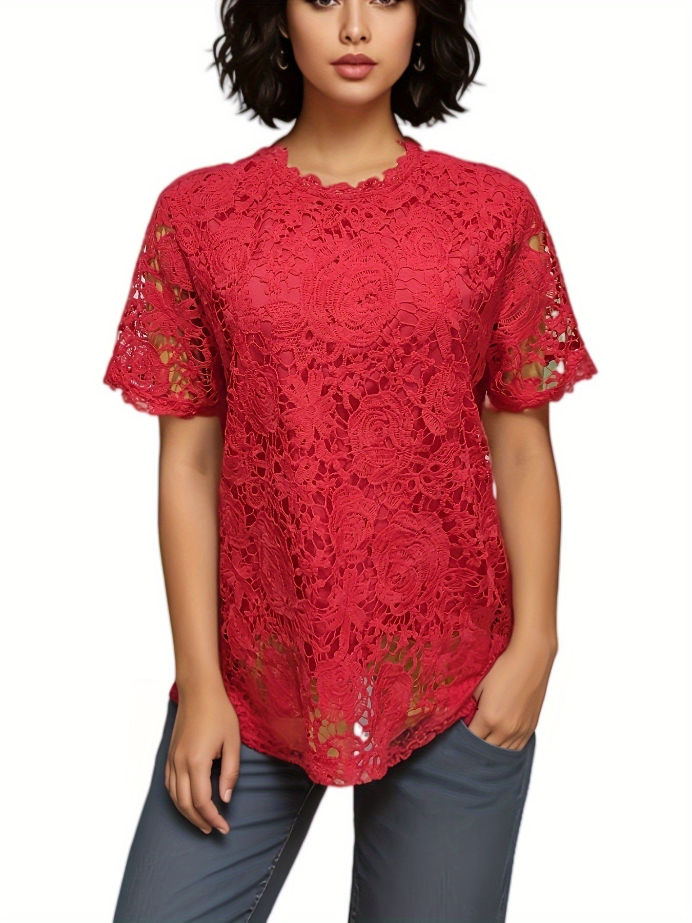Plus Size Floral Lace Blouse Short Sleeve Solid Color Spring Summer Casual