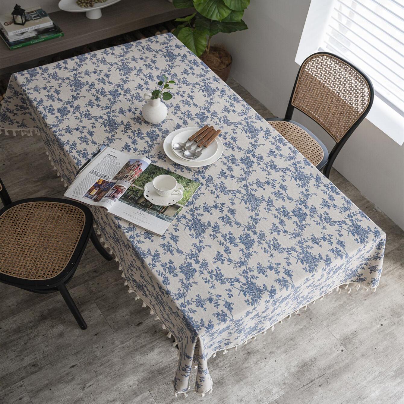 Vintage Blue Rose Tablecloth with Beige Fringe for Dining Occasions