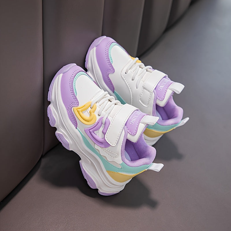 Girls' All-Season Fashion Sneakers with Heart Pattern, Color Block, Rubber Sole