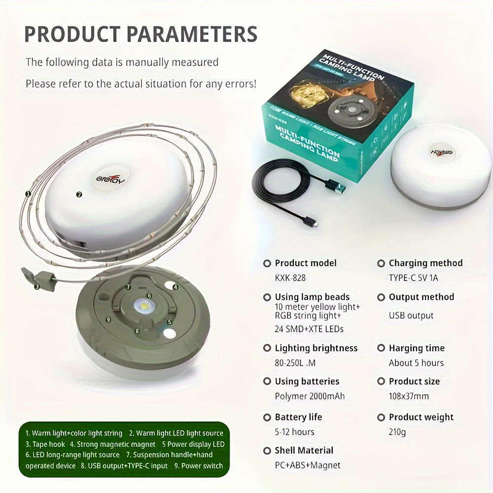 2-in-1 LED RGB Camping String Lights 10m Rechargeable Battery Outdoor Decor