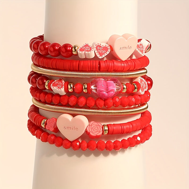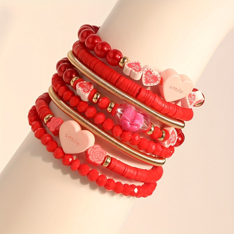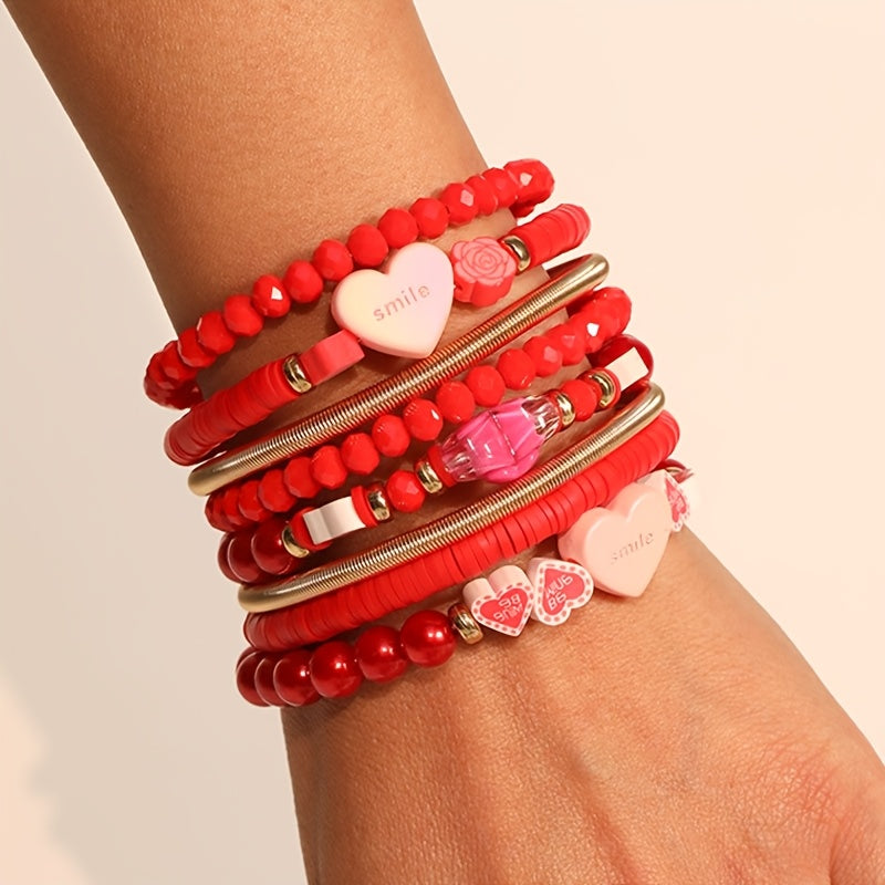 Red Beaded Bohemian Heart Bracelet for Women Valentine's Day Jewelry Multi-Layered