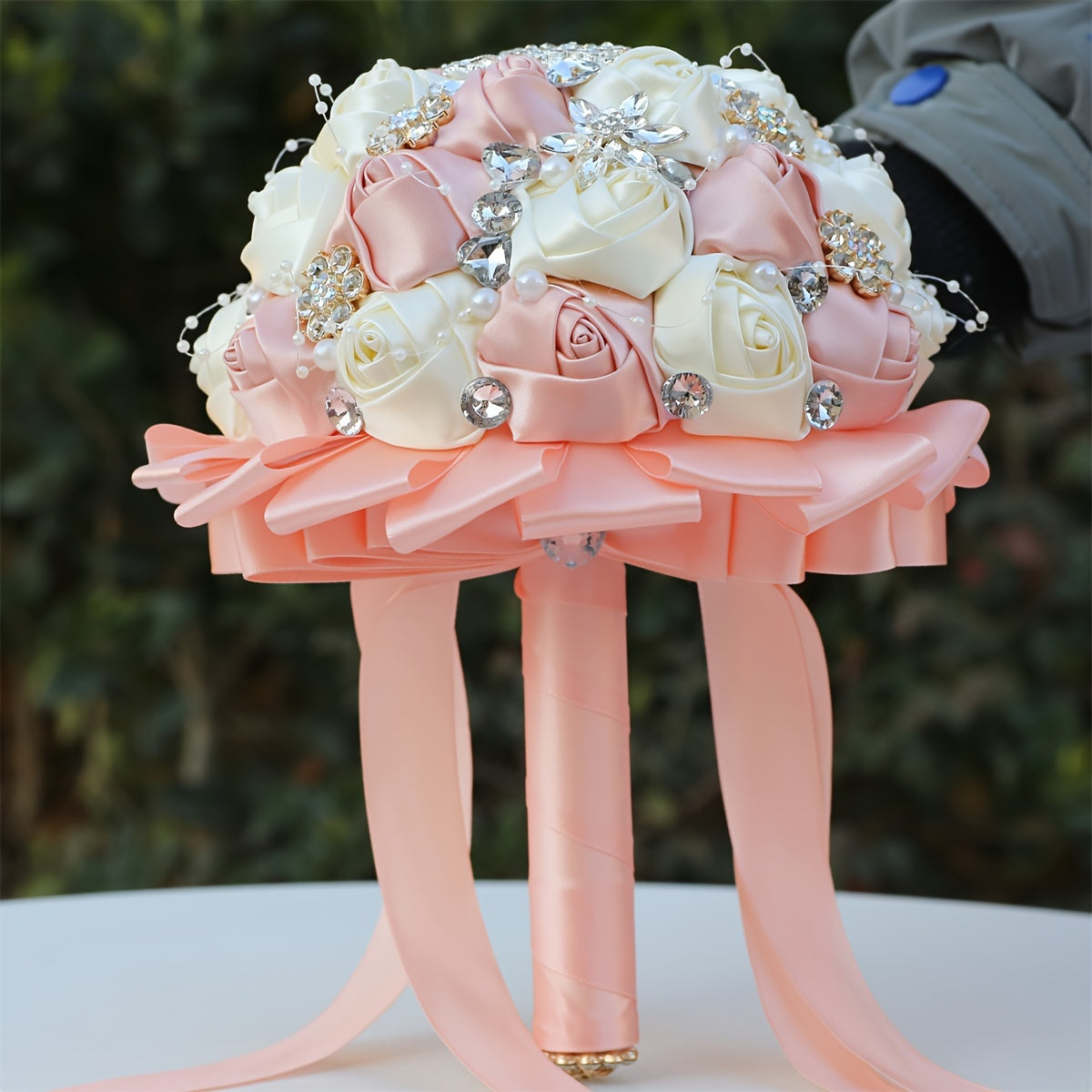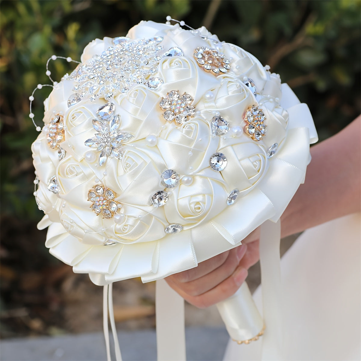 Handmade Wedding Bouquet Satin Flowers Rhinestones Faux Pearls for Bride Bridesmaids