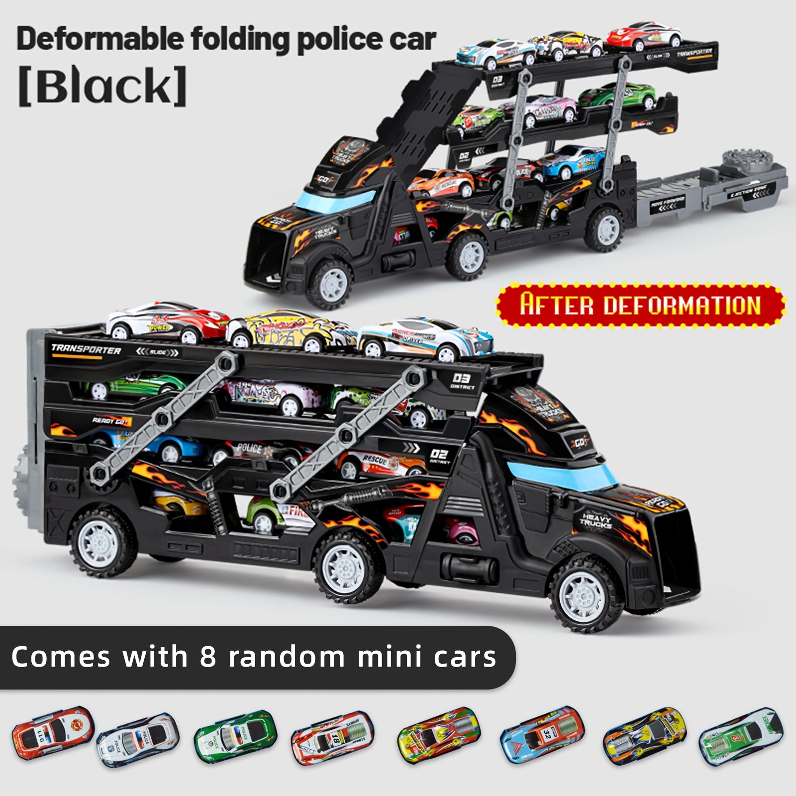 Transforming Police Toy Car with 8 Mini Cars Retractable Black Blue Flames Racing Graphics for Kids