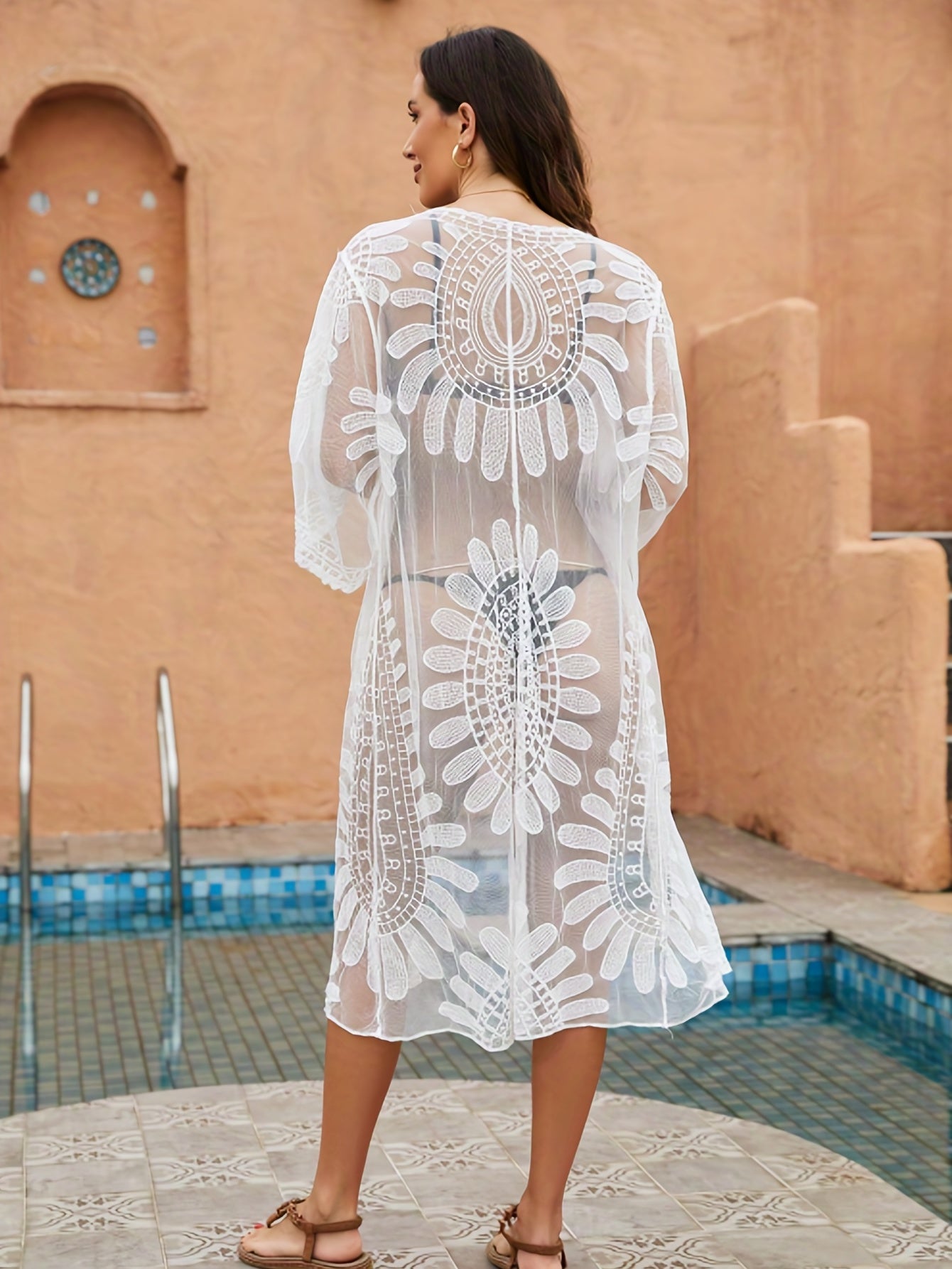 Women's Lace Embroidered Mesh Kimono Cover Up for Swimwear with Scallop Trim and Mid-Length Sleeves
