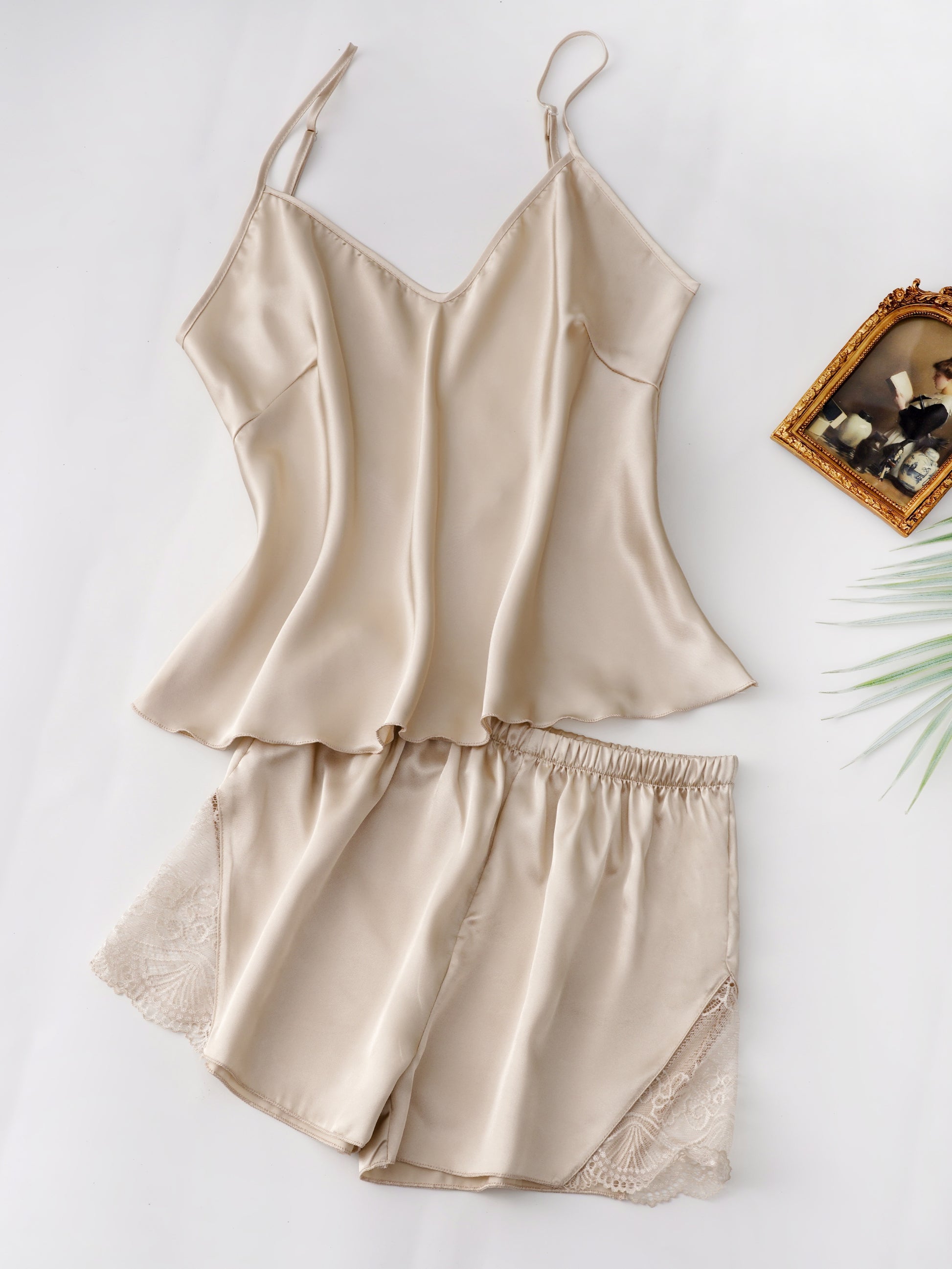 Women's Polyester Lace Pajama Set with V-Neck Cami Top and Elastic Waist Shorts for Summer Sleepwear