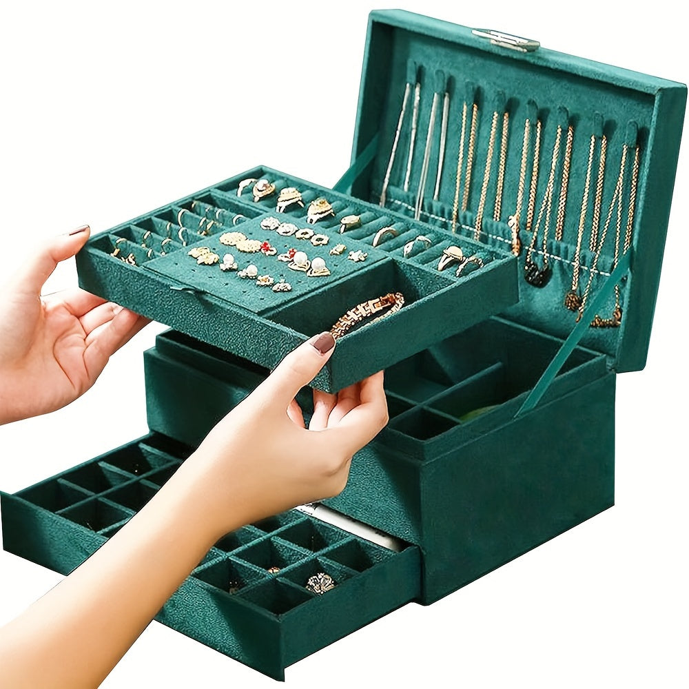 Dark Green Jewelry Storage Box for Girls with Three Drawers for Large Jewelry Sets
