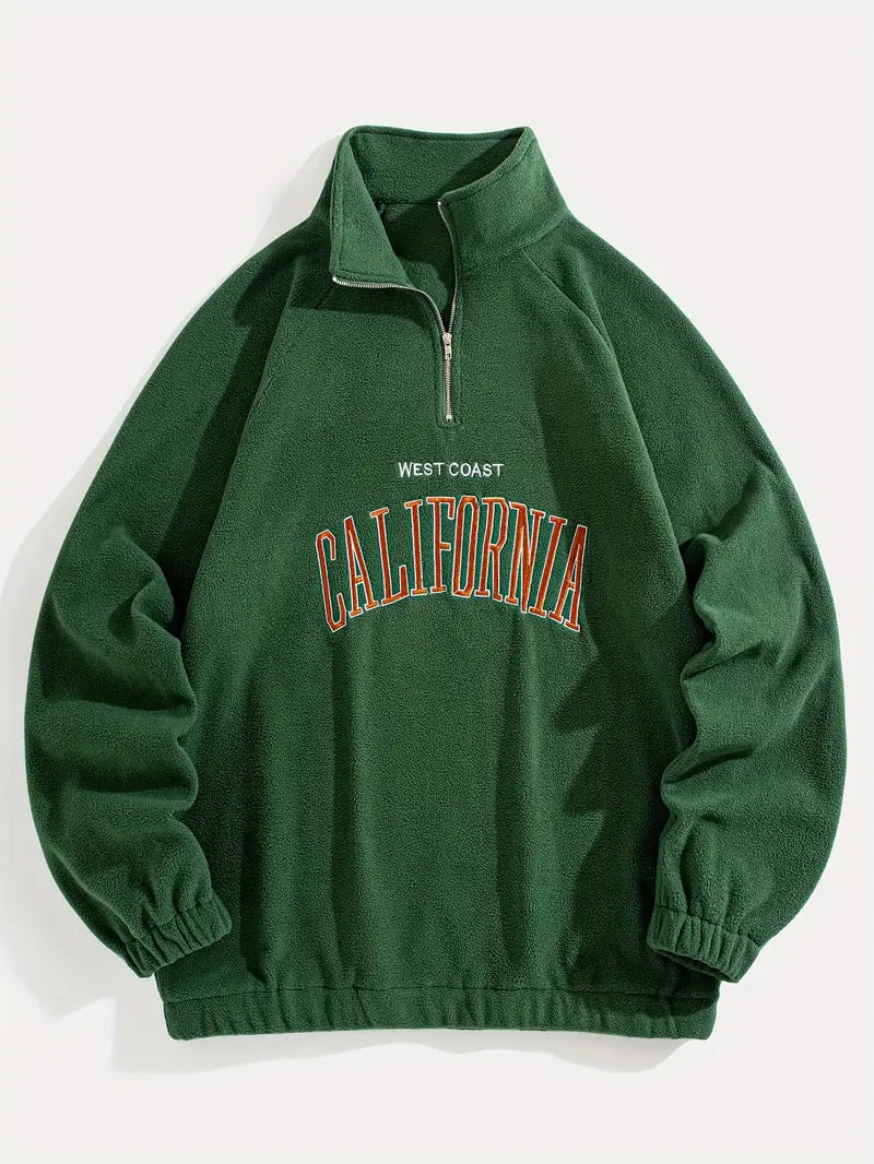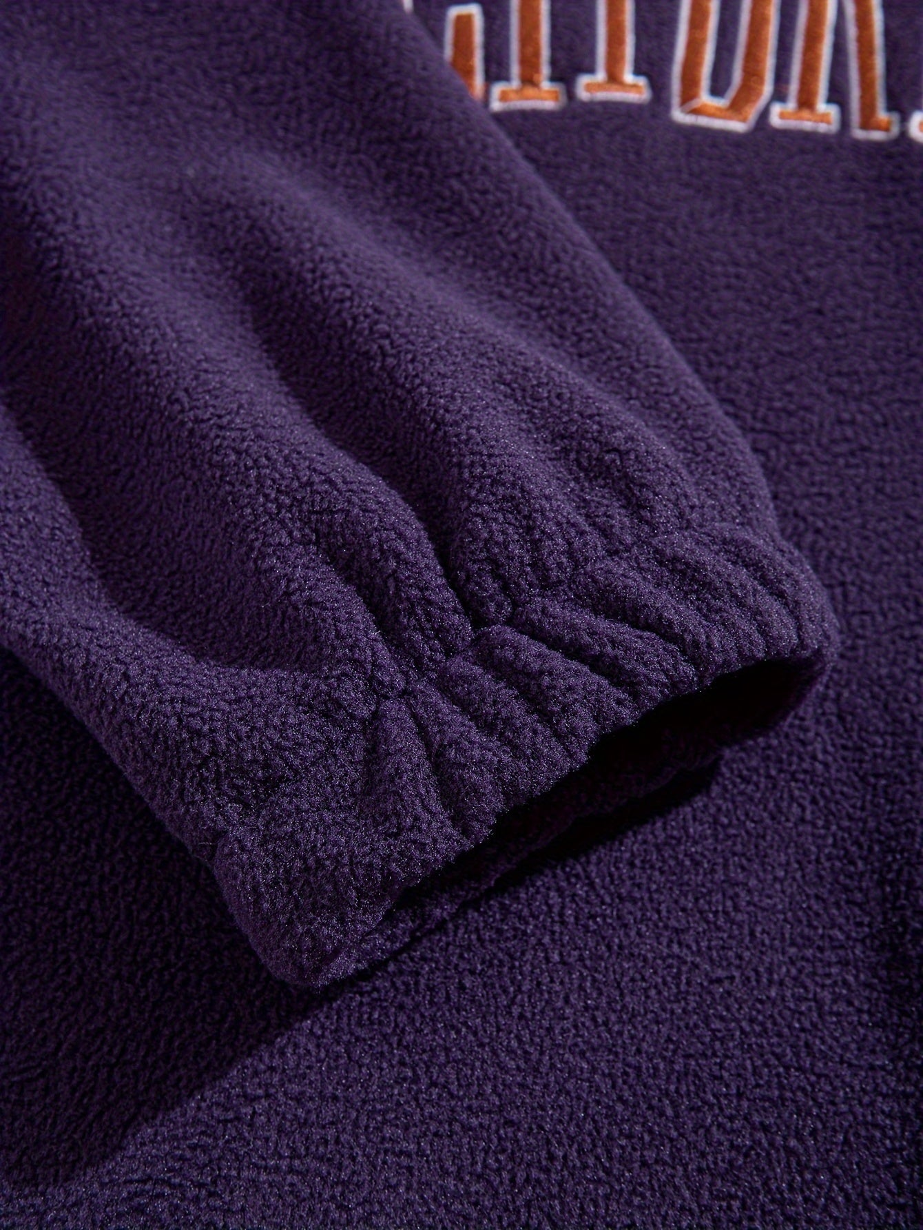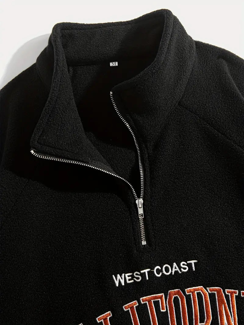 Men's Embroidered Polar Fleece Zip-Up Sweatshirt with Stand Collar and Ribbed Cuffs