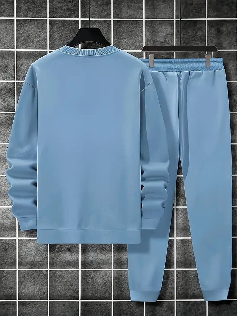 Men's Casual Polyester 2-Piece Pajama Set with Print Design Round Neck Pockets