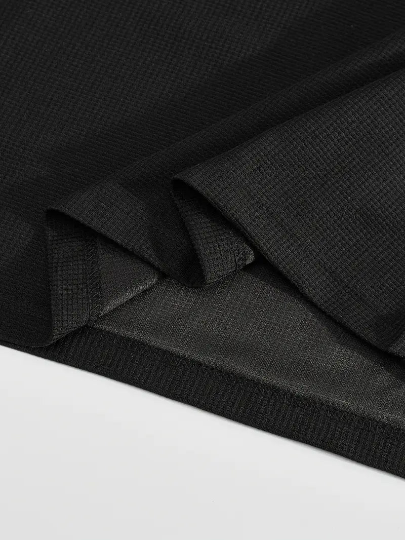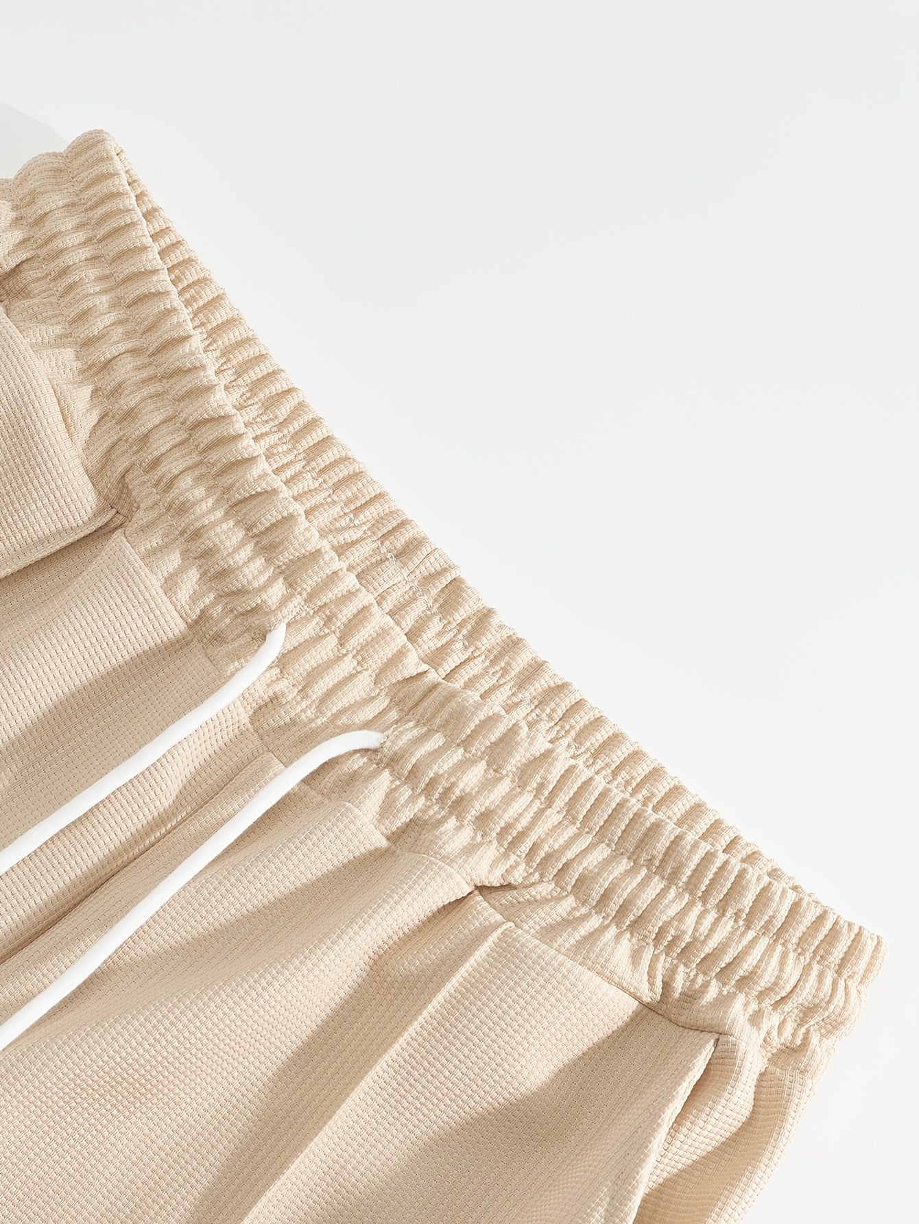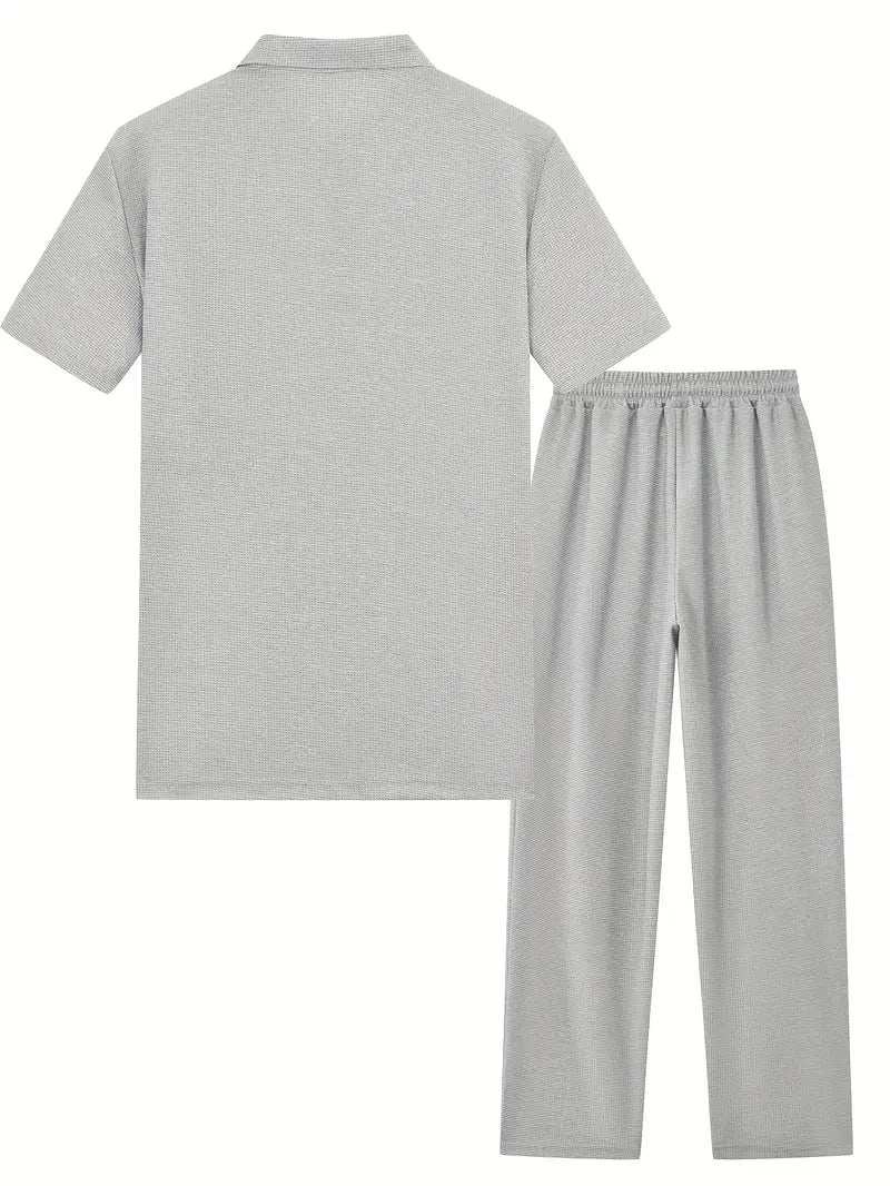 Men's Casual Outfit Waffle Knit Short Sleeve Zip-Up Shirt and Drawstring Pants Black Polyester Blend Summer