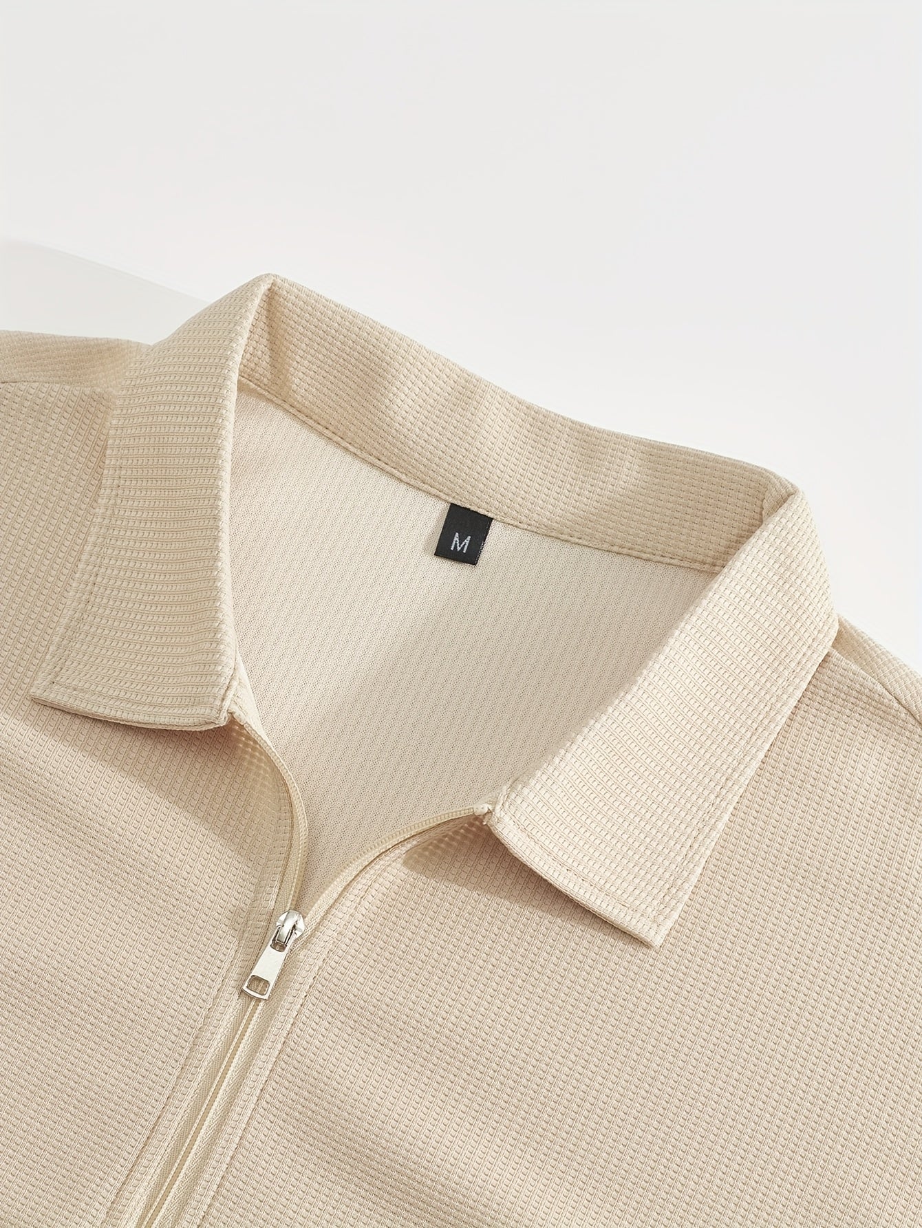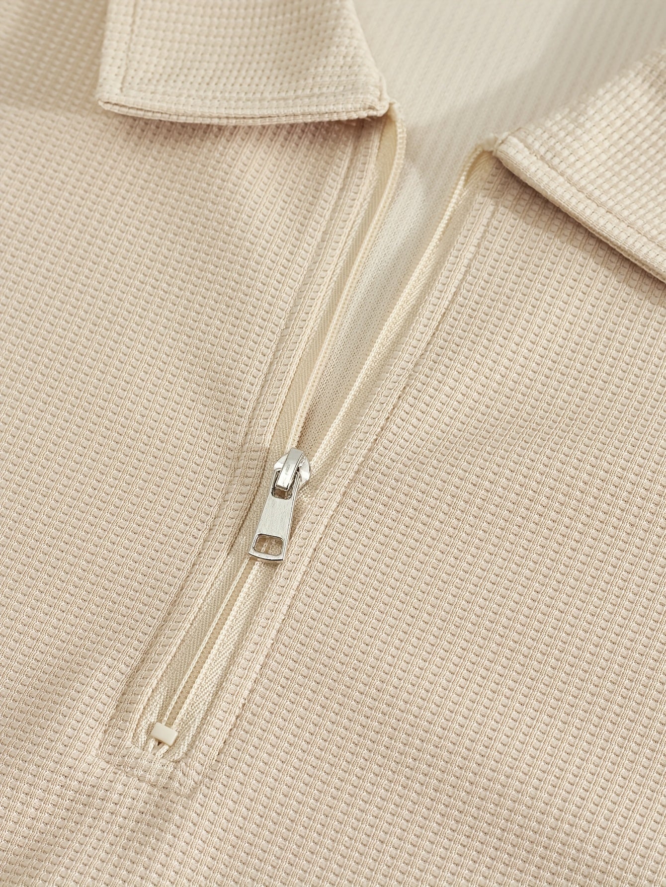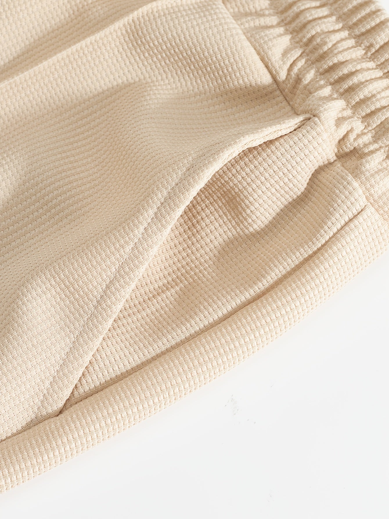 Men's Casual Outfit Waffle Knit Short Sleeve Zip-Up Shirt and Drawstring Pants Black Polyester Blend Summer